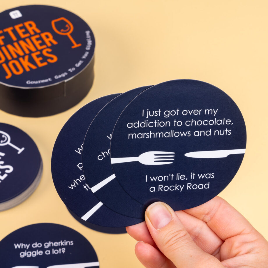 Waarom moeten augurken lachen? Welk fruit is het snelste fruit ter wereld? Die raadsels en meer grappen vind je in de After Dinner Jokes van Talking Tables. In dit blikje zitten 64 grappen die allemaal een foodthema hebben. Het is een leuke, originele manier van natafelen als er mensen komen eten, maar ook grappig om tevoorschijn te halen als één van je huisgenoten een slechte bui heeft.