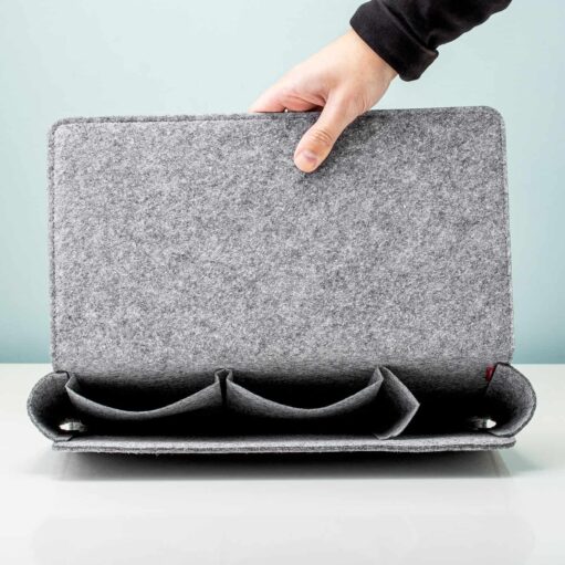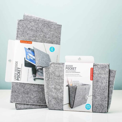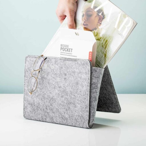 Een spannend boek, je telefoon, een leesbril, kauwgom, tijdschriften en je wekker: heb jij je hele nachtkastje ook vol liggen met spullen? Dan is de Bedside pocket van Kikkerland wat voor jou. Met deze bed organiser krijg je er in één keer een heleboel opbergruimte bij. De bedside pocket hang je aan de rand van je bed. Hij is geschikt voor gewone bedden, maar ook voor boxsprings. De bedzak is gemaakt van vilt en heeft een grijze kleur. Lekker neutraal, waardoor hij in elk interieur past.