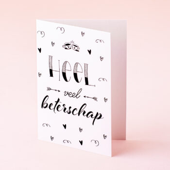 Wil je iemand beterschap wensen? Een cadeautje is leuk, maar een persoonlijke wens nog leuker! Maak je cadeautje compleet met de kaart Heel veel beterschap. Deze hippe kaart heeft zwarte illustraties met pijlen, hartjes en kopjes koffie. Op de kaart staat de tekst Heel veel beterschap. De dubbele kaart wordt geleverd met een witte envelop.