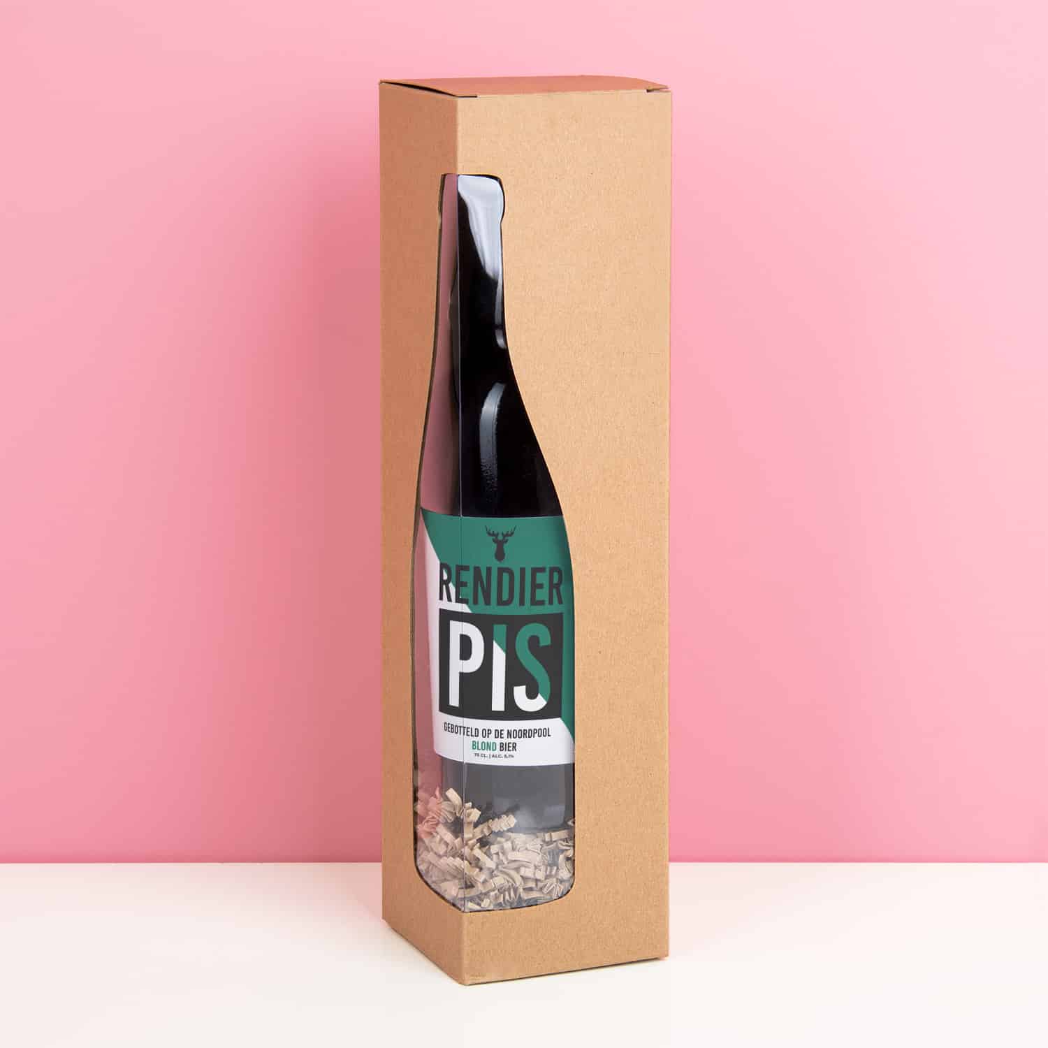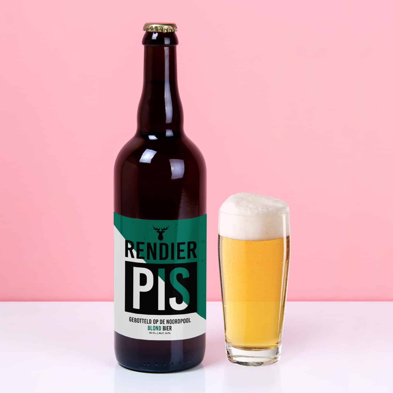 Bierfles Rendier pis (750 ml). Een fles heerlijk Belgisch blond bier speciaal voor de kerst. Op het etiket staat namelijk: Rendier pis. Gebotteld op de Noordpool. Met een inhoud van 750 milliliter kun je elk kerstdiner aan. Dit blonde bier is ook lekker bij kaasplankjes. Inhoud: 750 milliliter.