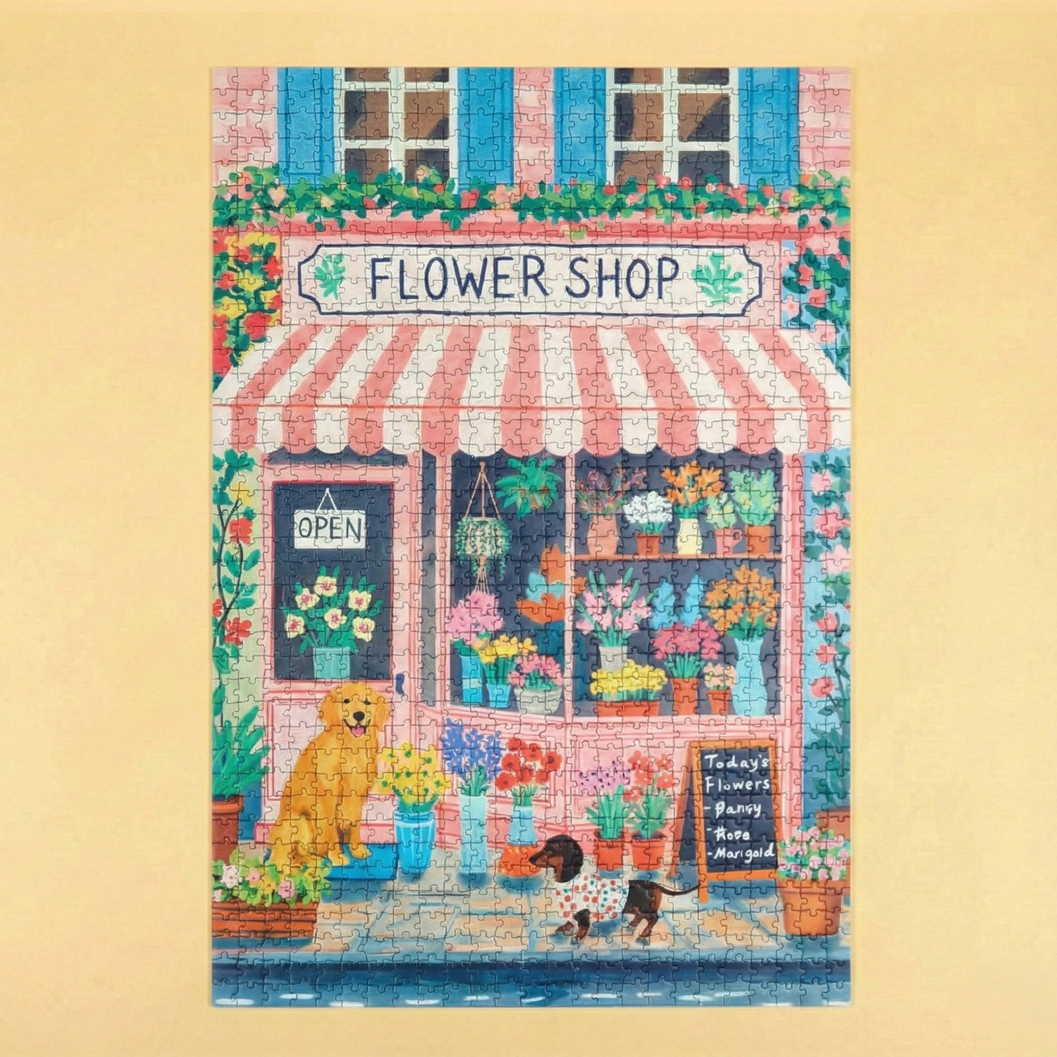 - Schattige puzzel met illustratie van een bloemenwinkel en honden
