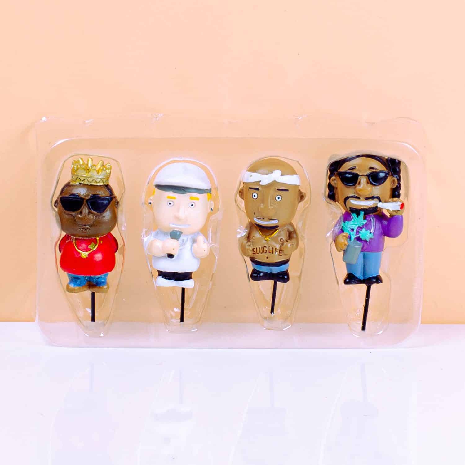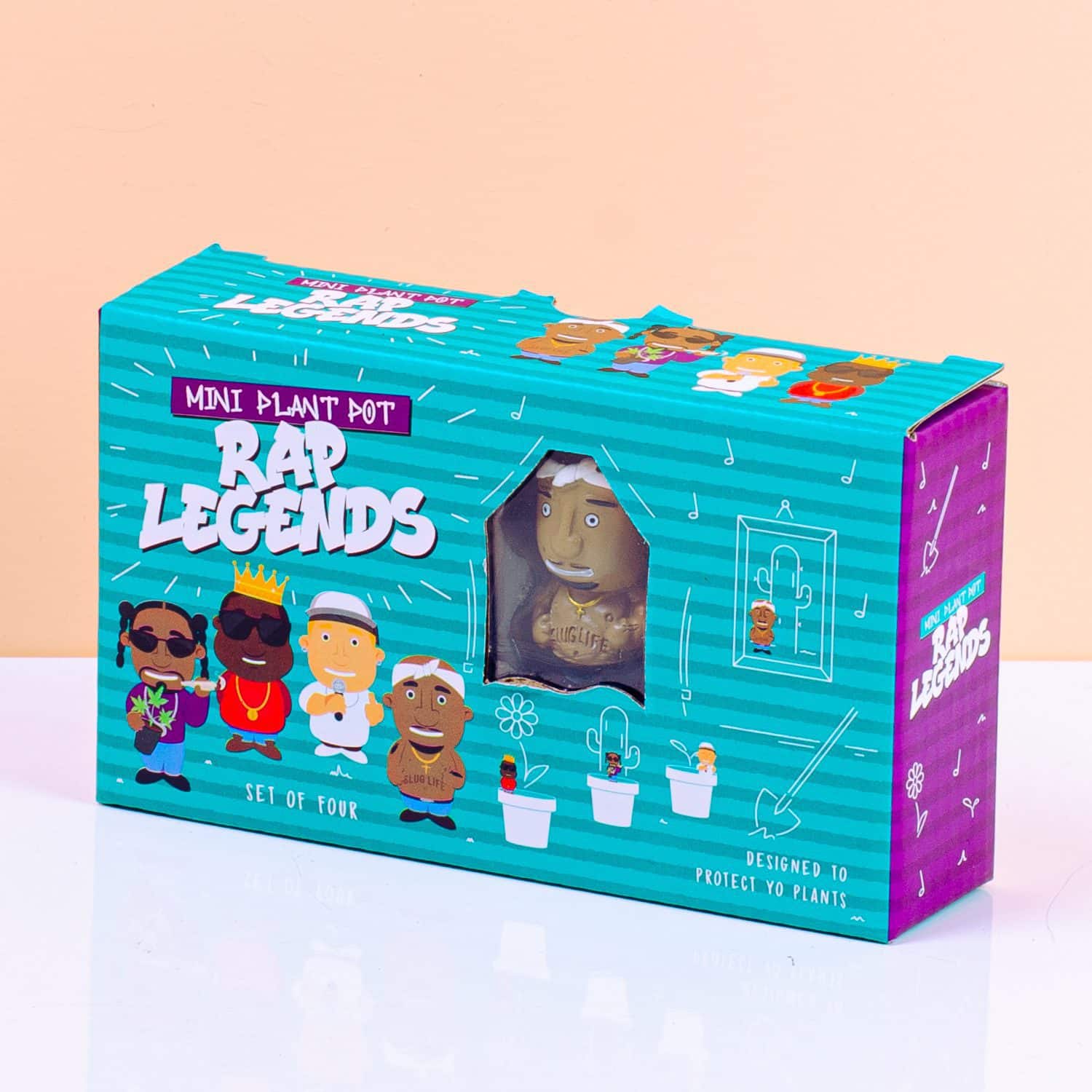 Bloempot rappers (set van 4) van Gift Republic. Set van vier minifiguurtjes die lijken op de rappers Tupac, Snoop Dogg, Eminem en the Notorious B.I.G.. Met deze minifiguren geef je je planten op een eenvoudige manier een stoere uitstraling. Afmeting verpakking: 14 x 4 x 9,5 centimeter.