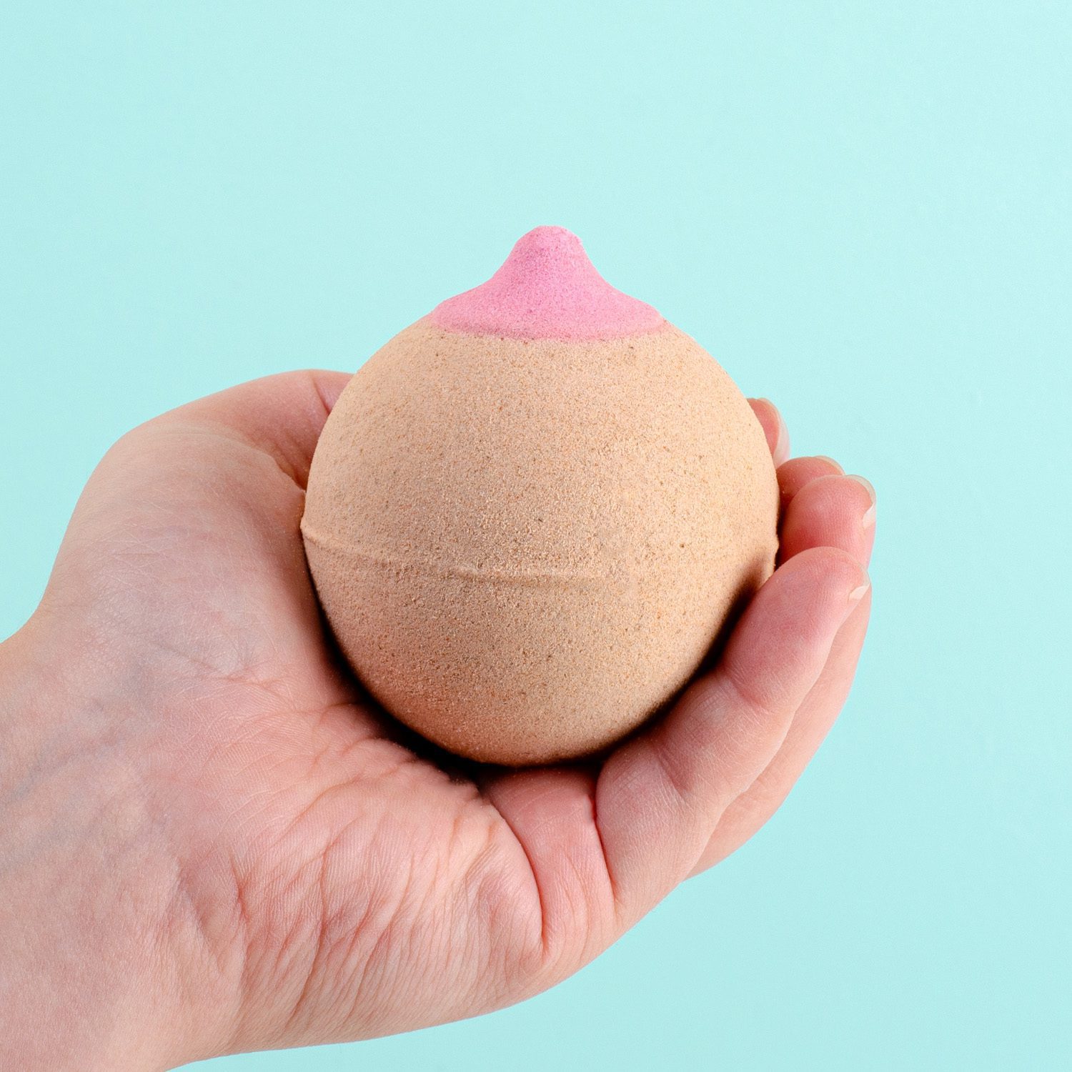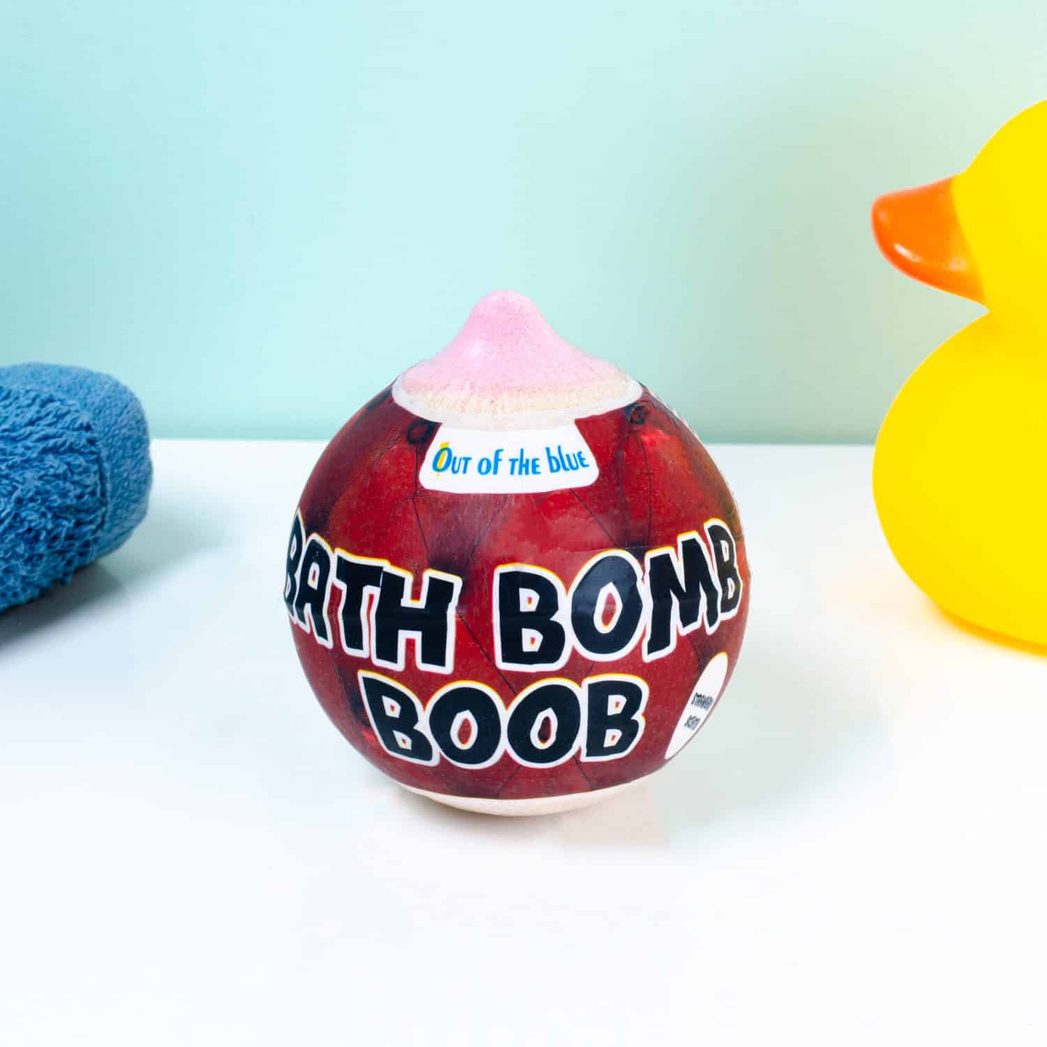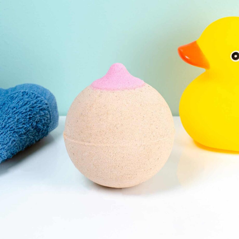 Borst bruisbal van Out of the Blue. Een bath bomb in de vorm van een roze borst, met heerlijk zoete aardbeiengeur. Grappige bruisbal om cadeau te geven met een vrijgezellenfeestje of voor Valentijnsdag. De bruisbal gooi je in het badwater onder de stromende kraan om te genieten van een heerlijk bruisend en ruikend bad. Gewicht: 180 gram.