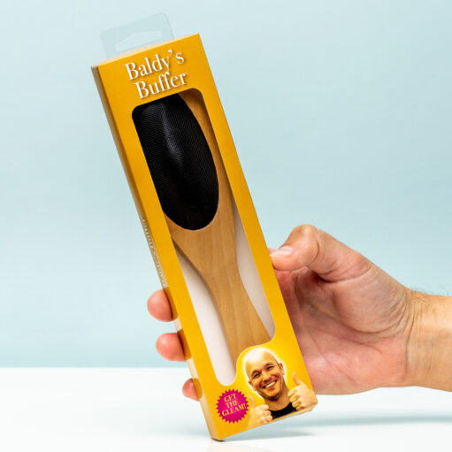 Kaal worden: de nachtmerrie van veel mannen. Maar gelukkig krijg je er een mooie glimmende kruin voor in de plek. Tenminste: als je hem oppoetst met de Borstel voor kale mannen natuurlijk. Deze borstel is het ultieme plagerige cadeautje voor een man die geen haar meer heeft. De borstel heeft namelijk geen tanden om het haar te borstelen, enkel een handvat en een stuk rubber.