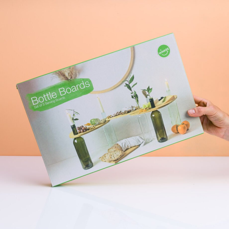 Dit jaar pak je helemaal uit op je verjaardag, met kerst of een andere feestelijke gelegenheid. Jij serveert je hapjes namelijk op de Bottle Boards serveerplanken (set van 3) van Winkee. Deze bamboe hapjesborden rusten op de hals van een (lege) wijnfles. Weinig werk, maar met een groots effect. Je kunt de borden los gebruiken, maar ook aan elkaar koppelen. Als je bloemen, takken of kaarsen in de wijnflessen steekt dan zien je hapjesborden er nog feestelijker uit.