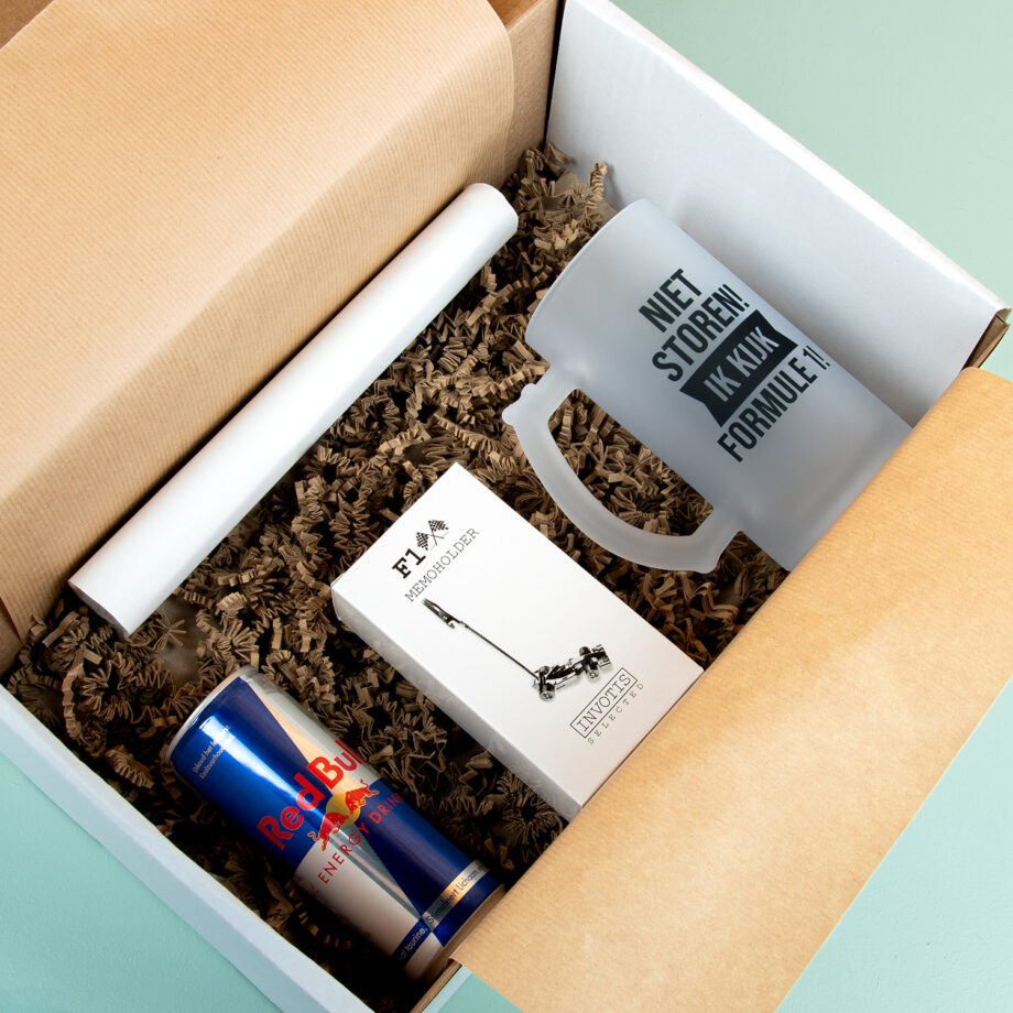 Een Formule 1 poster aan de muur, de Bierpul Niet storen Formule 1 in de hand en een memohouder met een raceauto aan de onderkant op je bureau: de Cadeaubox Formule 1 is het perfecte cadeautje voor hardcore Formule 1 fans. Zit jouw broer, vriendin of partner ruim twintig weekenden per jaar schreeuwend voor de tv om zijn of haar favoriete coureur aan te moedigen? Dan is dit het ideale pakket om cadeau te geven. In de luxe verpakking zit naast deze F1 producten ook nog wat lekkers: een blikje Red Bull.