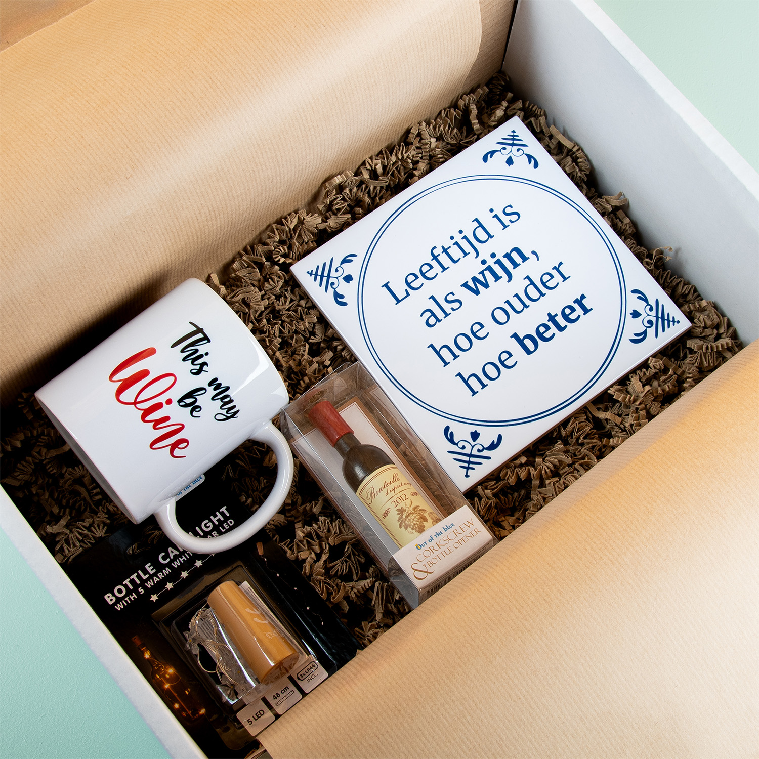 Draait jouw weekend ook vaak om borrelen met vrienden? Geef je favoriete borrelmaatje de Cadeaubox Wijn cadeau. Wie houdt daar nou niet van? In de cadeaubox zit een Mok This May Be Wine, een kurkentrekker, een Wijnfles lampje – Witte sterren en een Tegeltje Leeftijd is als wijn.