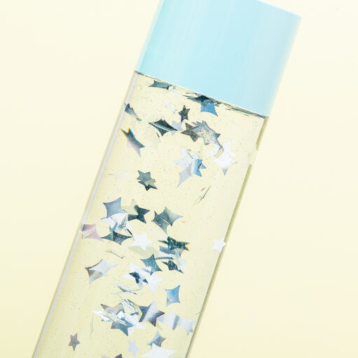- In de transparante vloeistof zweven de zilverkleurige sterretjes