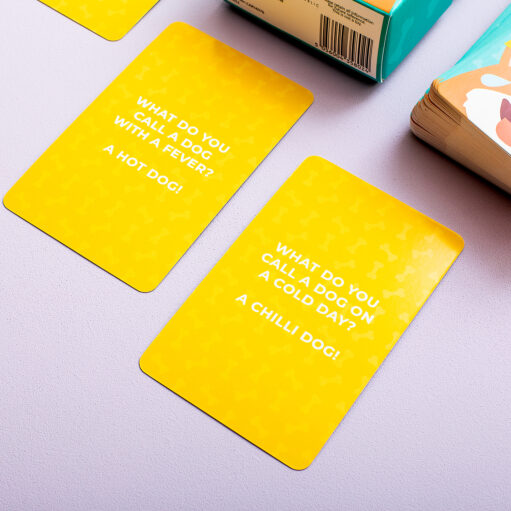 Ben jij helemaal dol op honden? En maak je graag grappen? Dat ben jij de perfecte persoon voor de Dog Jokes kaarten van Gift Republic. Deze set bevat honderd kaarten met grappen en raadsels over je favoriete dieren. De Dog Jokes kaarten heeft raadsels als: What’s the biggest problem with corgi jokes? They’re too short!