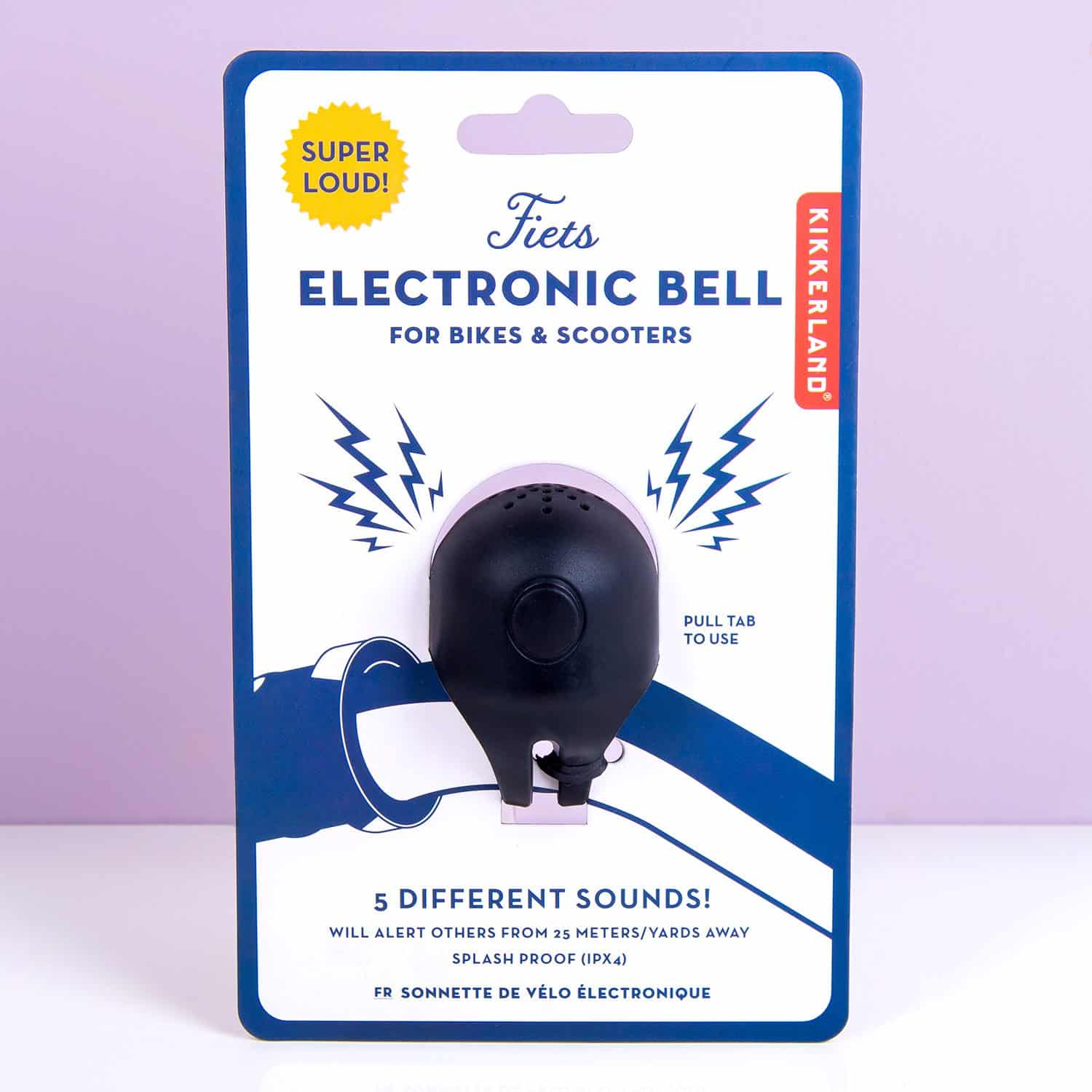 Elektronische fietsbel van Kikkerland. Fietsbel met vijf verschillende geluiden die je kunt activeren door op een knop te drukken. Deze extra luide fietsbel zorgt ervoor dat mensen je al op 25 meter afstand horen aankomen. Hij is IPX4 plenswaterdicht, wat inhoudt dat je hem ook in de regen kunt gebruiken. Hij is eenvoudig op je stuur te bevestigen en er ook weer af te halen. Werkt op 2 CR2032 batterijen. Afmeting: 4,5 x 4 x 10,5 centimeter.
