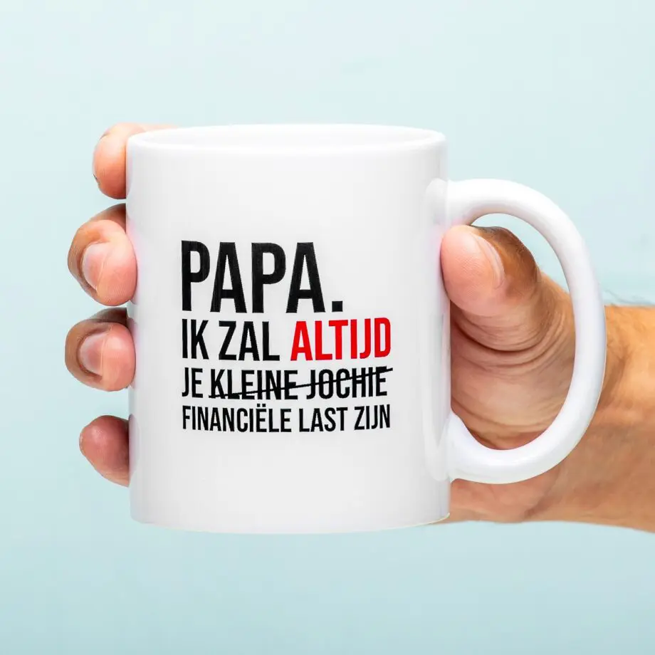 Niemand kan jouw smekende blik weerstaan: je vader al helemaal niet. Met de Financiële last Vaderdag mok onderstreep je dat maar weer eens. Op de mok staat de tekst Papa. Ik zal altijd je kleine meisje/kleine jochie zijn, waarbij kleine meisje/jochie is doorgehaald en in plaats daarvan financiële last staat. Een perfect cadeautje voor Vaderdag! Ah toe pap, ik heb nog maar 50 euro nodig voor dat leuke feestje. Dat gun je me wel, toch?
