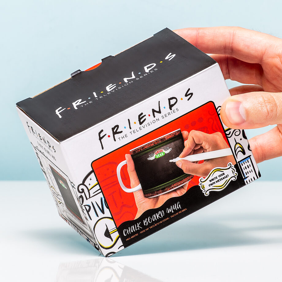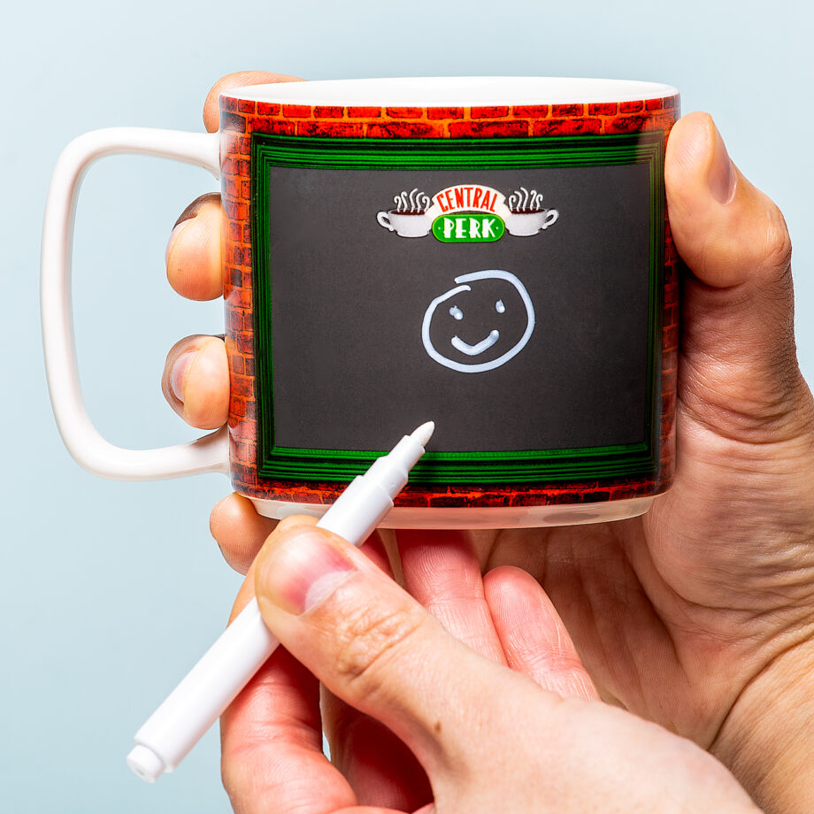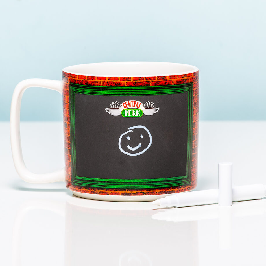 Drink jij je koffie met of zonder suiker? Heb je het liefst een latte of toch een kop thee? Met de Central Perk krijtmok van Friends geef jij je bestelling eenvoudig door aan je vriend of collega. Heeft je partner een steuntje in de rug nodig? Dan kun jij ook een lief berichtje op deze unieke Friends mok schrijven. Het krijtbord ziet eruit als het menu van Central Perk en is te beschrijven met de meegeleverde krijtpen.