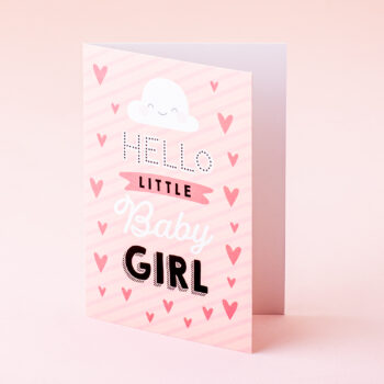 Hoera, er is een lief klein meisje geboren. Je wilt natuurlijk de nieuwe ouders zo snel mogelijk feliciteren. Daarvoor is de Geboortekaart Hello Little Baby Girl perfect. Met deze lieve dubbele kaart feliciteer je de ouders met de pasgeboren spruit. De kaart heeft een roze achtergrond met hartjes, een wolkje en de tekst Hello Little Baby Girl. De dubbele kaart heeft een A6 formaat en is leeg aan de binnenkant. Je krijgt er een witte envelop bij.