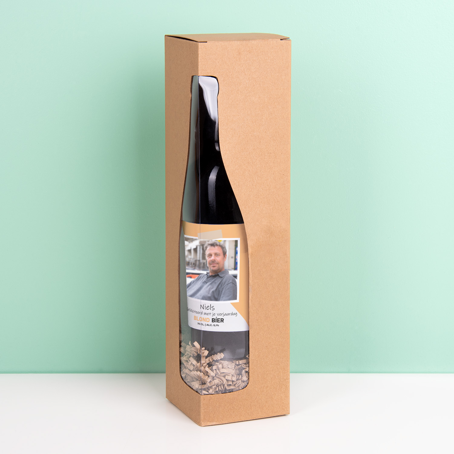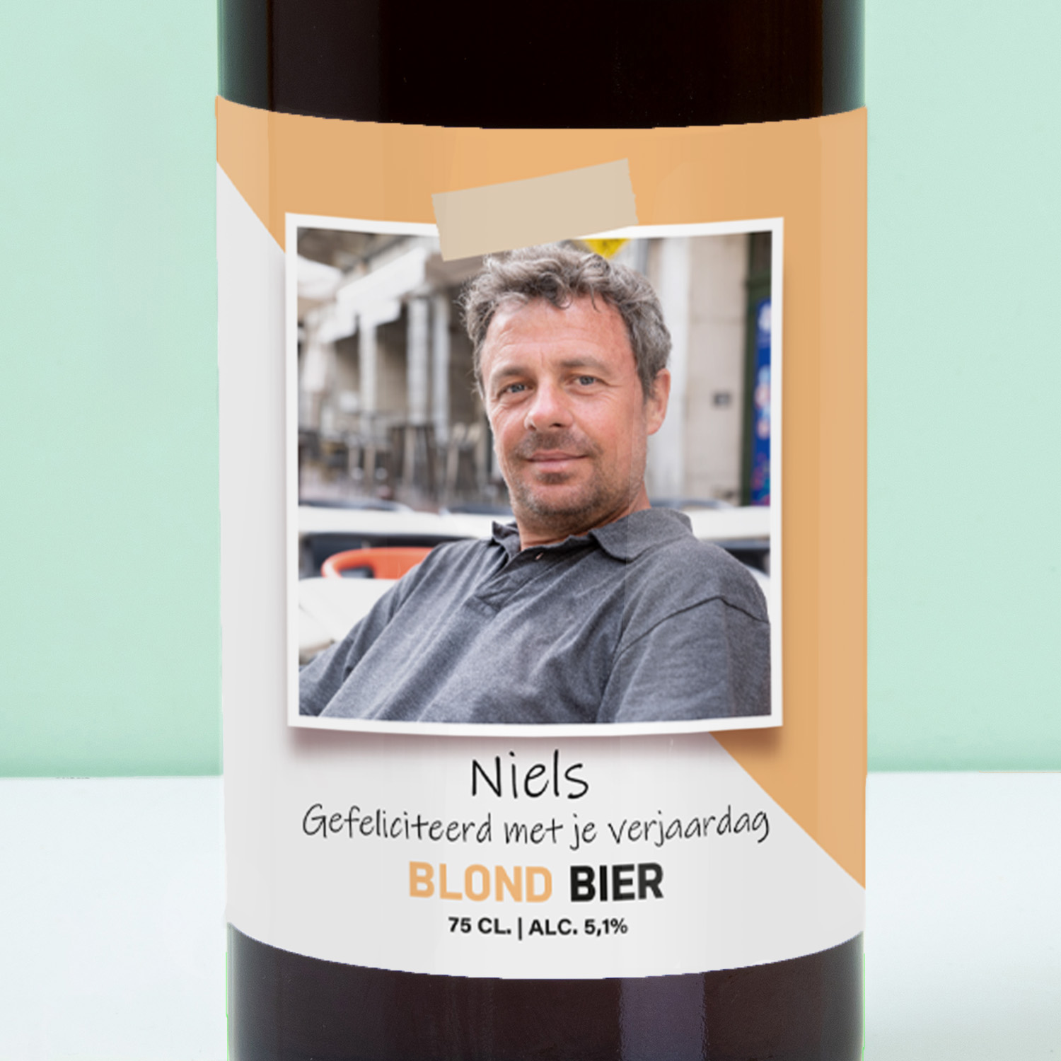 Wat is er leuker als cadeau dan een lekkere fles blond bier uit België? Een fles bier die bedrukt is met een foto van de ontvanger! De Gepersonaliseerde bierfles met foto is een uniek en origineel cadeautje voor iedereen die graag van een biertje geniet. Je kunt een foto van de ontvanger uploaden en onder de foto een onderschrift typen. Feliciteer je collega met zijn pensioen, verras je pa met Vaderdag of geef je beste vriendin een biertje cadeau met kerst.