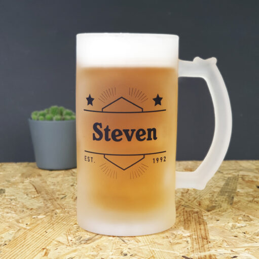 Mannen en hun bier: het is een wonderlijke relatie. De echte bierdrinker zal zijn favoriete biertje nog herkennen met een blinddoek om. Ken jij zo’n bierliefhebber en wil je hem een kado geven dat past bij zijn favoriete drankje? Geef hem dan de Gepersonaliseerde bierpul Naam badge cadeau. Op de bierpul wordt de naam en het geboortejaar van de ontvanger gedrukt. Zo kan ‘ie zijn eigen bierglas overal mee naartoe nemen. De bierpul met naam is een uniek en persoonlijk cadeau.
