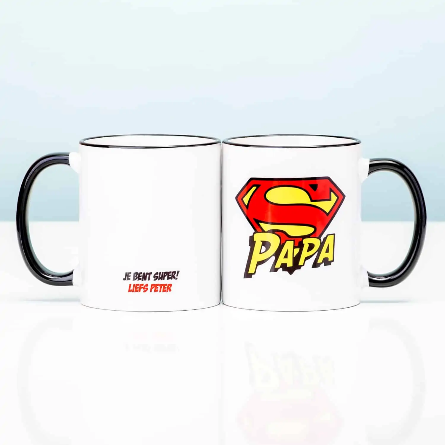 Laat je vader met zijn verjaardag of met Vaderdag zien hoe belangrijk hij voor je is. Dat doe je door hem de Gepersonaliseerde mok Superpapa te geven. De beker heeft een opdruk van een Superpapa logo. Op de achterkant staat de tekst: Je bent super! Liefs, en dan jouw naam. Door de mok te personaliseren krijgt je vader een echt uniek en persoonlijk cadeau. Met zoโn cadeautje sla je de plank zeker niet mis. We durven zelfs wel te wedden dat dit zijn favoriete beker wordt.
