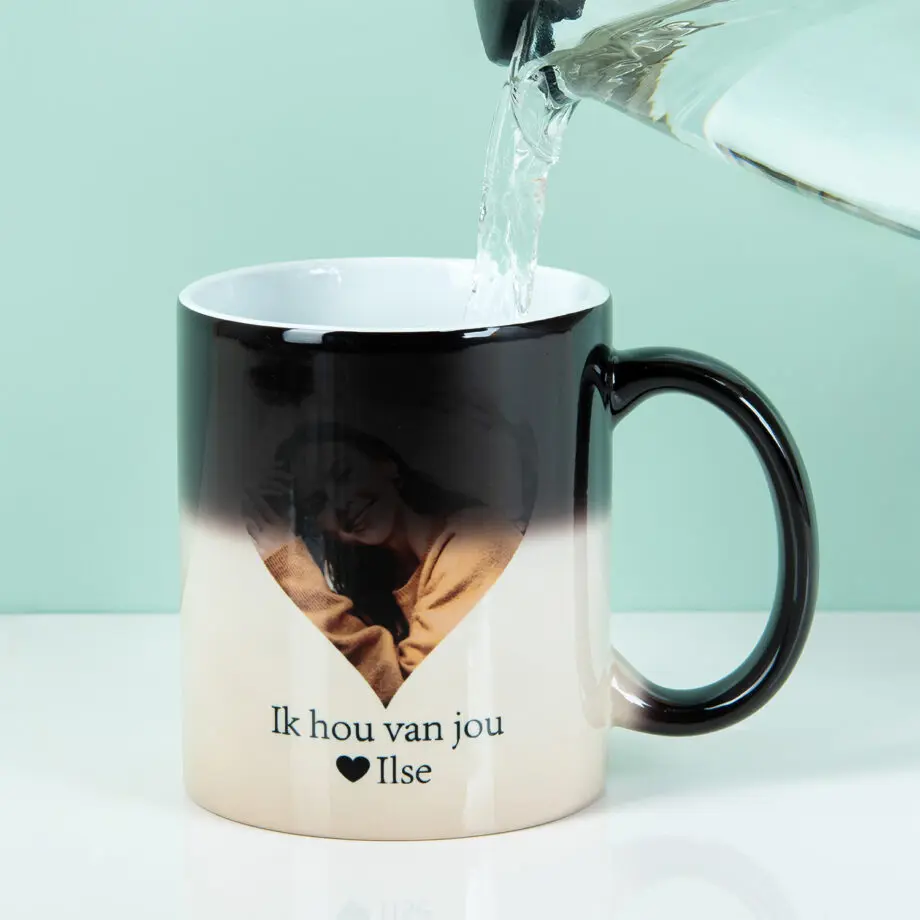 Wat is de beste manier om een geliefde te verrassen? Met een persoonlijk cadeautje dat ze elke dag kunnen gebruiken. We beloven je dat de Gepersonaliseerde warmtegevoelige mok met foto in de smaak valt. De mok lijkt zwart, tot je er een hete drank in schenkt. Dan verschijnt de foto die je hebt uitgekozen om de mok mee te bedrukken. De mok is niet alleen uniek en persoonlijk, maar ook heel praktisch. Je kunt hem namelijk elke dag gebruiken voor koffie of thee.