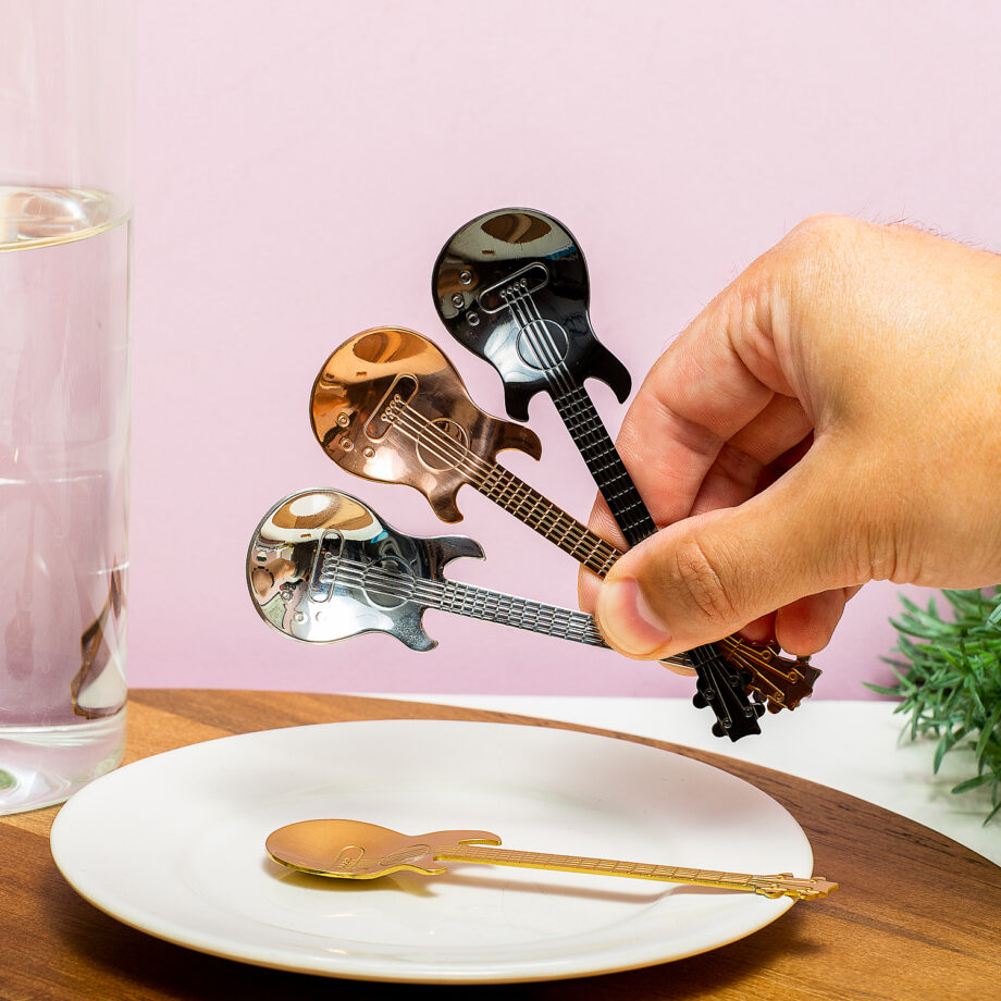 Thee niet mannelijk? Dat is natuurlijk onzin. Maar wil je je kopje thee er nog stoerder uit laten zien, dan gebruik je één van de Gitaar theelepels (set van 4) van Winkee. Deze grappige theelepels hebben het uiterlijk van een elektrische gitaar. Ze roeren met plezier de suiker door je koffie of thee en geven je tegelijkertijd een coole look. Set van vier theelepels van rvs, met allemaal een andere kleur.