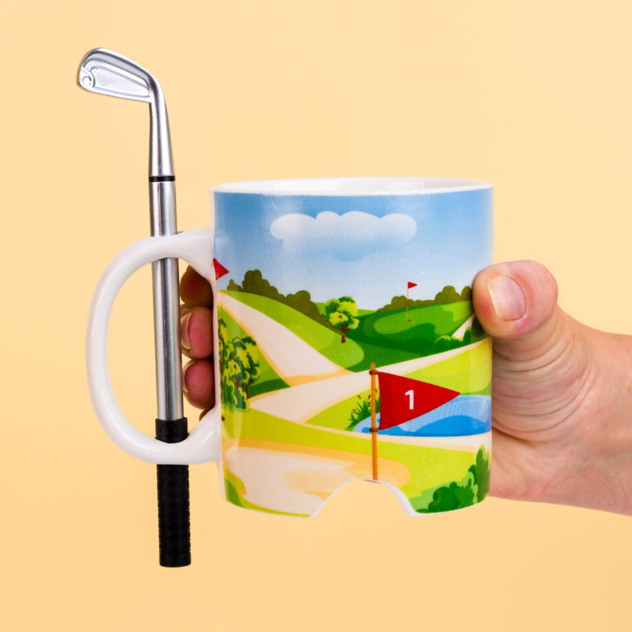 Waarmee verras je iemand die bijna met pensioen gaat en waarvan je nu al weet dat ‘ie hele dagen op de golfbaan door zal brengen? Met de Golf mok met golfclub en bal van Out of the Blue natuurlijk! Een grappige koffiebeker die ervoor zorgt dat je zelfs op het werk al met je hobby bezig kunt zijn. De mok komt namelijk met een golfclub – ook nog eens te gebruiken als pen – en een balletje. Kun jij de bal onder het gat door slaan?