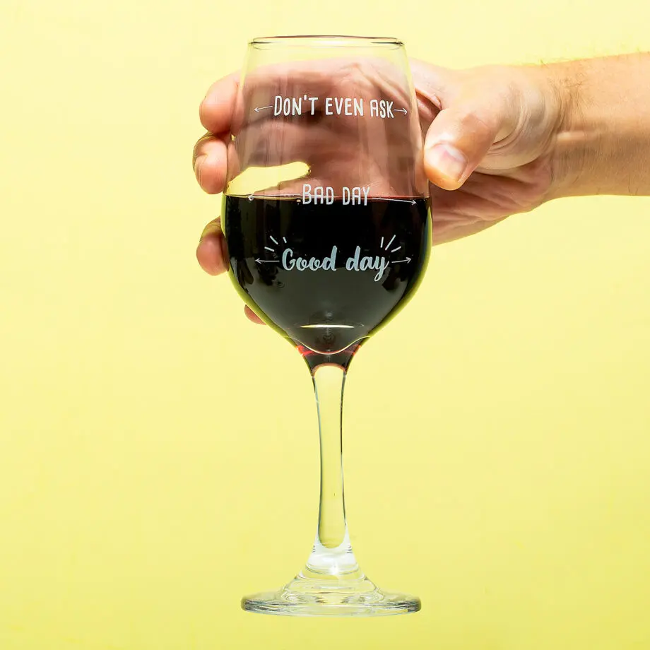 Een goede dag gehad? Dan heb je niet zoveel wijn nodig om bij te komen! Maar was het een slechte dag, dan verdien je meer. Dat is de gedachte achter het Good Day Bad Day wijnglas van Out of the Blue. Op het glas staan de woorden: good day, bad day en donโt even ask.