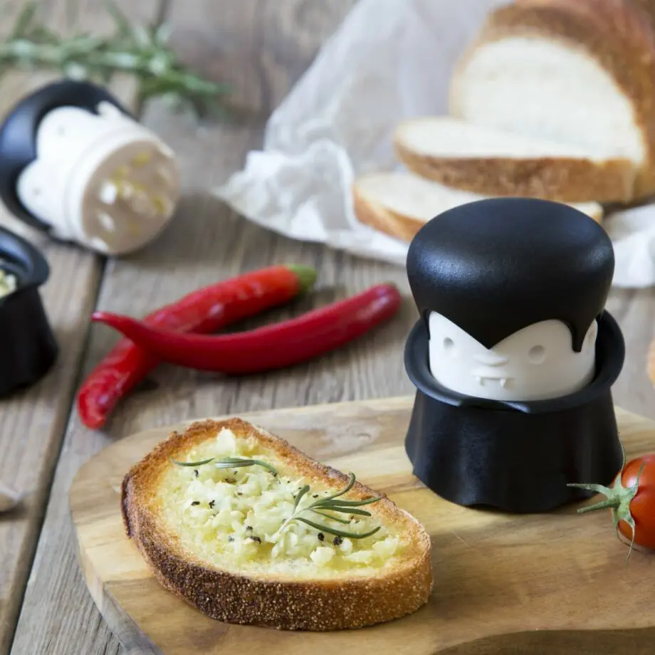 Een vampier eng? Niet als ‘ie bereid is om je te helpen in de keuken! Voor fans van Twilight en The Vampire Diaries hebben wij een uniek keukenhulpje: de Gracula knoflookpers van Ototo. Stop een teentje in zijn gewaad, draai zijn hoofd en de geperste knoflook valt zo in het bakje.