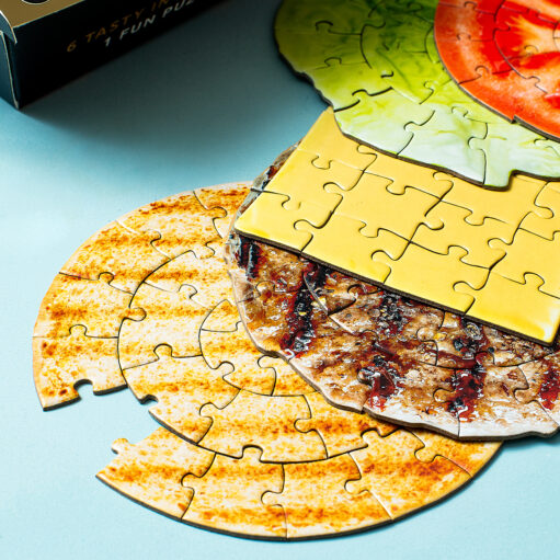 Zin om te puzzelen, maar ook dol op originaliteit? De Hamburger puzzel (160 stukjes) van Pikkii is er één die je waarschijnlijk nog niet eerder hebt gezien. Deze unieke puzzel bestaat uit maar liefst zes verschillende lagen, die samen de hamburger vormen. Zo puzzel je eerst het onderste deel van het broodje in elkaar, dan de sla, de burger, het plakje kaas en tomaat en tot slot de bovenkant van het bolletje.