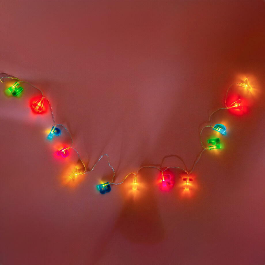 - Vrolijk lichtsnoer met letters in groen, geel, rood, oranje, paars en blauw