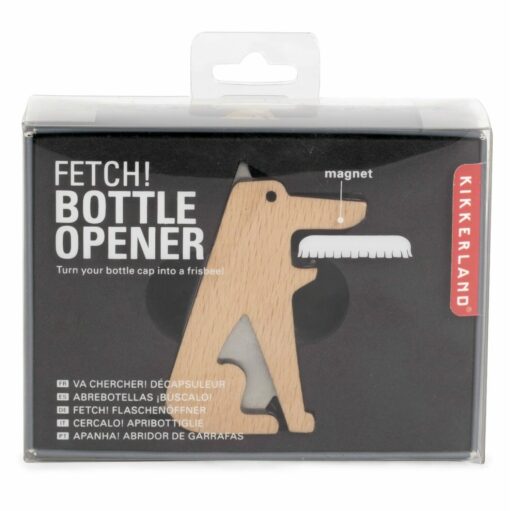 Flesjes openen wordt veel leuker met de Fetch! Bottle opener van Kikkerland. Als je je flesje ermee open maakt, dan ziet de flesopener eruit als een pup die net een een frisbee heeft gevangen. De opener in de vorm van een hond bijt kroondoppen eenvoudig van glazen flesjes af. Hij is er ook sterk genoeg voor, want hij is gemaakt van roestvrij staal en gelakt beukenhout. Wil je op een originele manier je bierflesjes openen? Gebruik dan de Fetch! Bottle opener.