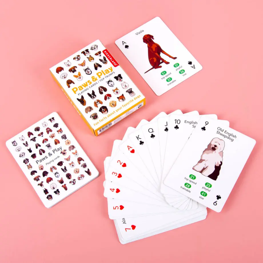 Het Honden kaartspel van Kikkerland is leuk voor jong en oud: je kunt er mee pokeren, maar ook het spelletje Top Trumps mee spelen. Hierbij probeer je elkaar te overtreffen, door de hond te selecteren met de hoogste of laagste score op het gebied van snelheid, maat of speelsheid. Deze scores staan onderaan op elke kaart.
