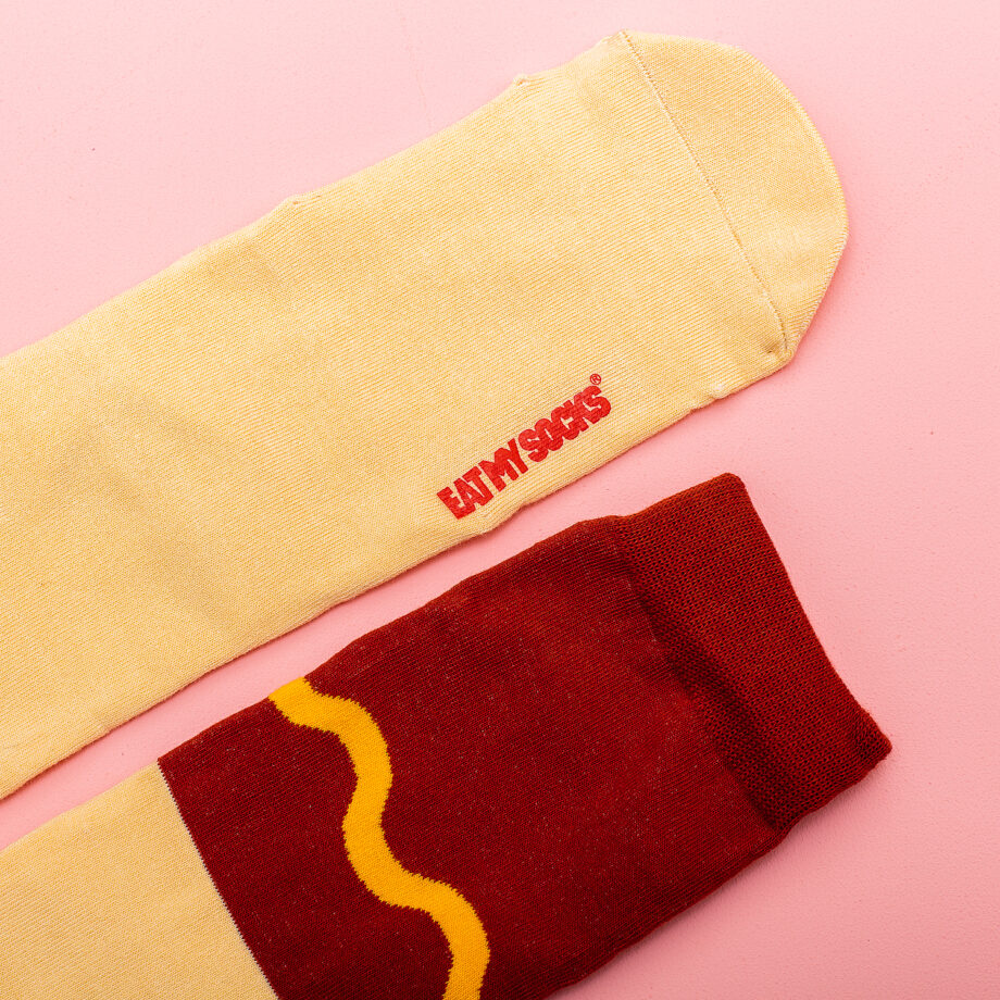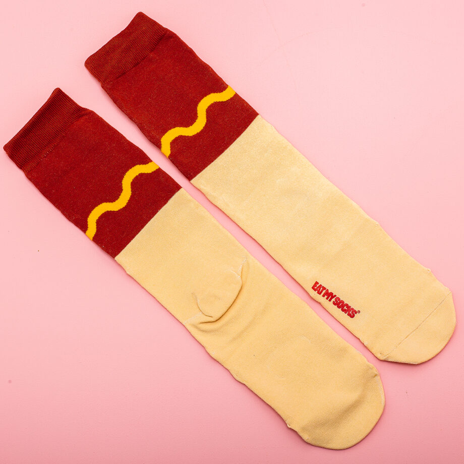 Is mosterd op je voeten geen probleem voor jou? Dan zijn de Hot Dog sokken van Eat My Socks je op het lijf geschreven! Super grappige sokken die er in de verpakking uit zien als hotdog: leuk voor jezelf, maar ook om cadeau te geven. In het doosje zit één paar sokken. De beige kleur die het broodje vormt draag je aan je voeten, het worstje en de mosterd zitten om je kuiten. Deze sokken zijn altijd een succes.