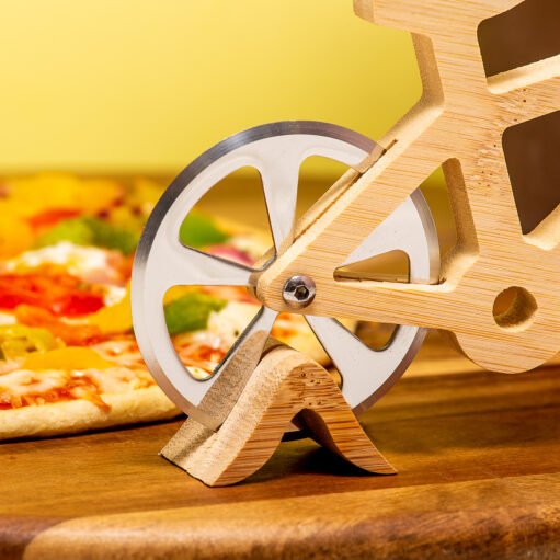 Neem een aanloopje en de Houten fiets pizzasnijder van Winkee fiets zo door je pizza. Obstakels als plakken salami, gesmolten kaas en harde korsten zijn geen probleem voor deze pizzasnijder in de vorm van een fiets. Met de standaard blijft ‘ie rechtop staan.