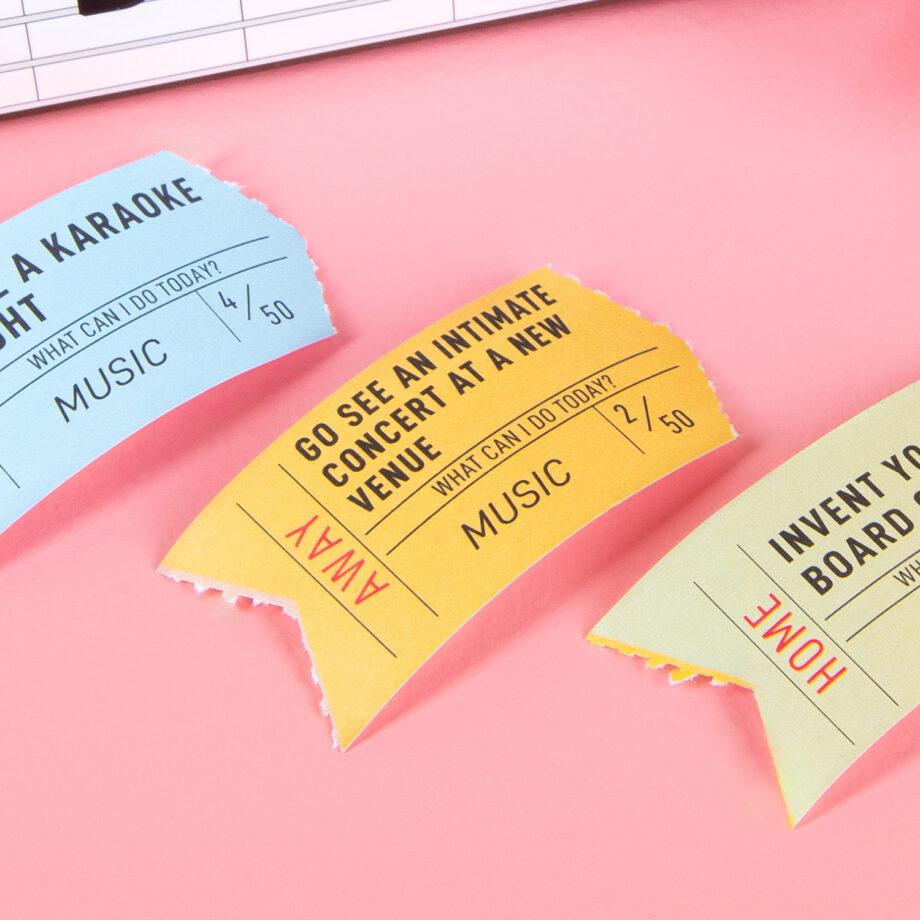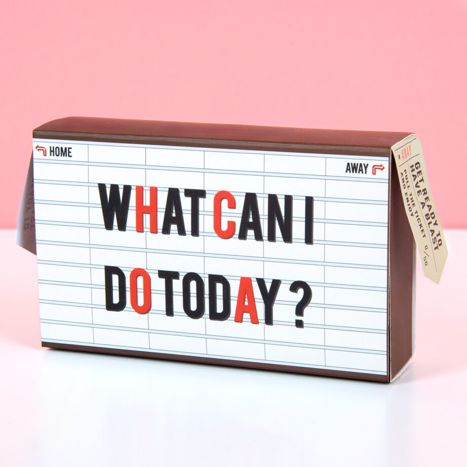 Verveel je je vaak op een vrije dag? Of ben je het zat om elke keer maar weer hetzelfde te doen? Met de Inspiratiebox What Can I Do Today van DOIY heb je maar liefst 100 ideeën tot je beschikking wat je vandaag zou kunnen doen. Wil je thuis blijven? Kies dan een ticket uit de home-categorie. Ga je liever weg? Kies dan voor een away-ticket. Misschien moet je wel de bus nemen naar de populairste toeristische trekpleister bij jou in de buurt en een dagje toerist spelen. Er zitten maar liefst 100 Awesome Plans in de inspiratiebox. Let op: de opdrachten zijn geschreven in het Engels.