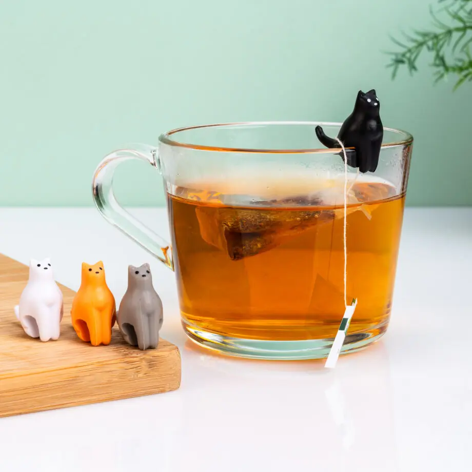 Thee is heerlijk, maar รฉรฉn ding is ongelofelijk vervelend: de labeltjes hebben altijd de neiging om in je hete water te vallen. Met de Kat theezakjeshouders (set van 4) van Kikkerland kun je dat voorkomen. Deze katten – een set van vier – hebben een staart waar je het touwtje van je theezakje omheen kunt slaan. Hierdoor kan het labeltje niet meer in je thee vallen. En heeft de thee voldoende getrokken, dan haal je het zakje met kat en al uit je beker. Een ideaal cadeautje voor theeleuten.