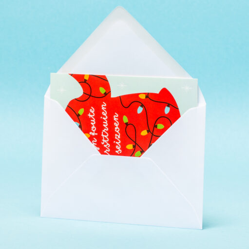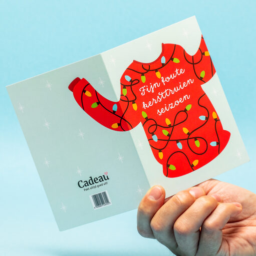 Er zijn altijd van die malloten die in oktober hun foute kersttrui al uit de kast trekken. Ken jij ook zo iemand? Stuur hem of haar de Kerstkaart Fijn foute kersttruien seizoen. Op deze grappige kerstkaart staat een rode ugly Christmas sweater, met kerstverlichting en de tekst: fijn foute kersttruien seizoen. Perfect geschikt voor kerstfans die het liefst in de zomer al trots zouden lopen zweten in hun foute kersttrui.