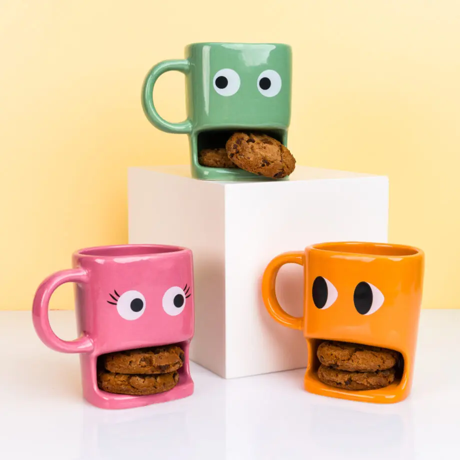 Een beker waar je niet alleen koffie in kunt serveren, maar ook een lekker chocolate chip cookie? De Koekjesmok met ogen van Fisura is er helemaal klaar voor. Deze grappige beker ziet eruit alsof hij een gezicht heeft. Hij heeft niet alleen ogen, maar ook een grote mond waar je het koekje in legt. Super grappig om je bezoek mee te verrassen of om cadeau te geven.