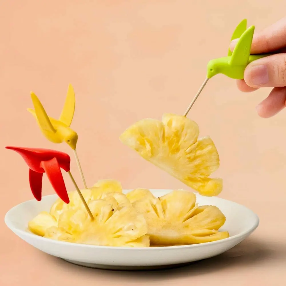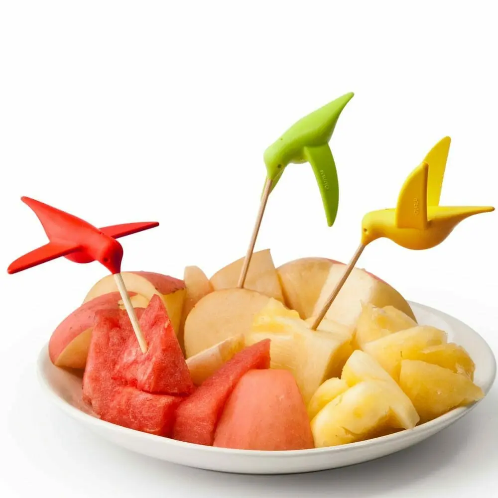 De Kolibrie cocktailprikkers van Qualy zijn de perfecte gast op elk feestje: deze vrolijke gekleurde kolibries helpen je aan een lekkere snack รฉn ze zijn duurzaam. Je vervangt alleen de satรฉprikker, die de snavel van de supersnelle vogeltjes vormt. De vogeltjes zelf zijn herbruikbaar. Onthoud welke kleur je hebt en je hoeft niet steeds een nieuwe prikker te pakken.