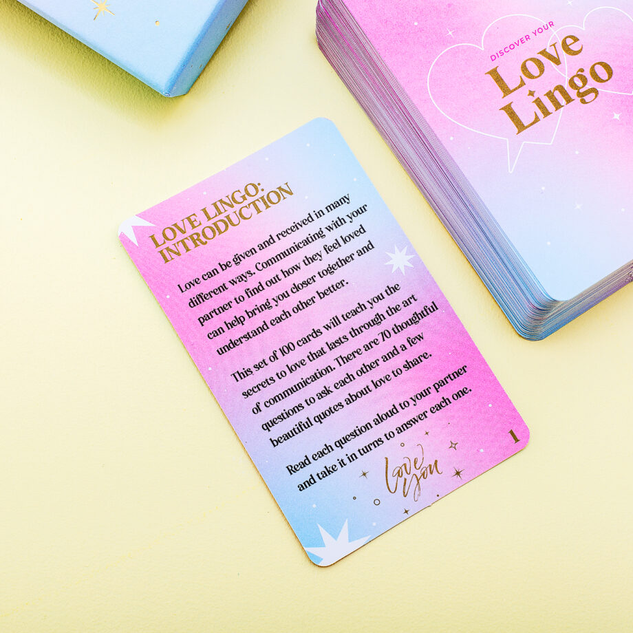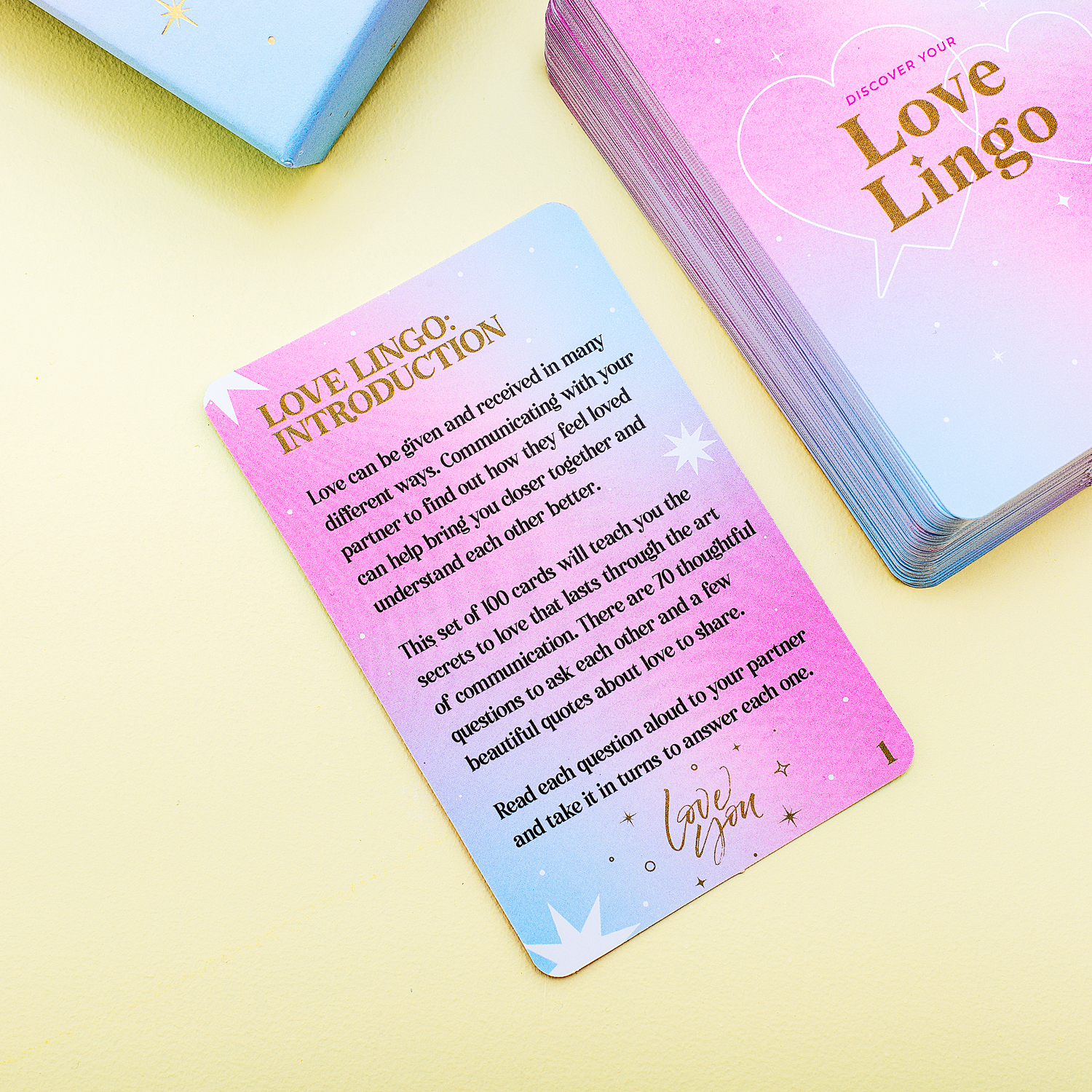 Romantische quotes en vragen over jullie relatie: daar bestaan de Love Lingo kaarten van Gift Republic uit. Deze kaartenset is een lieve, originele manier om meer over je relatie te praten met je partner en zo een nog betere verbinding te vormen. Op de kaarten staan vragen zoals: What’s one thing I could do to surprise you? In totaal zitten er zeventig vragen in de kaartenset van honderd kaarten.