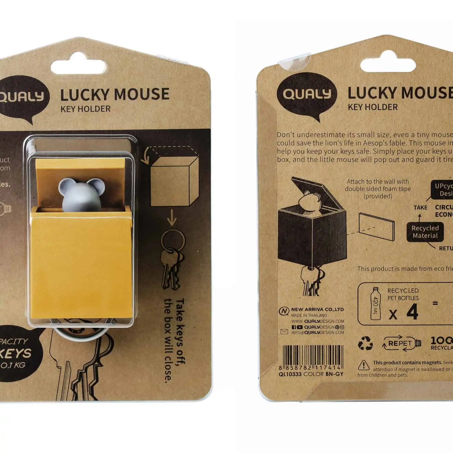 Geef je sleutels een veilige plek bij de Lucky Mouse sleutelhouder van Qualy. Wanneer jij thuiskomt en je sleutels aan hem ophangt, springt de muis uit het doosje. Zo is er altijd iemand blij wanneer je thuiskomt en raak jij je sleutels nooit kwijt. Dit muisje bewaakt jouw sleutels met zijn leven. De sleutelhouder is bruin met grijs en gemaakt van vier gerecyclede petflessen. Hij is gemakkelijk aan de muur te bevestigen met dubbelzijdig tape.