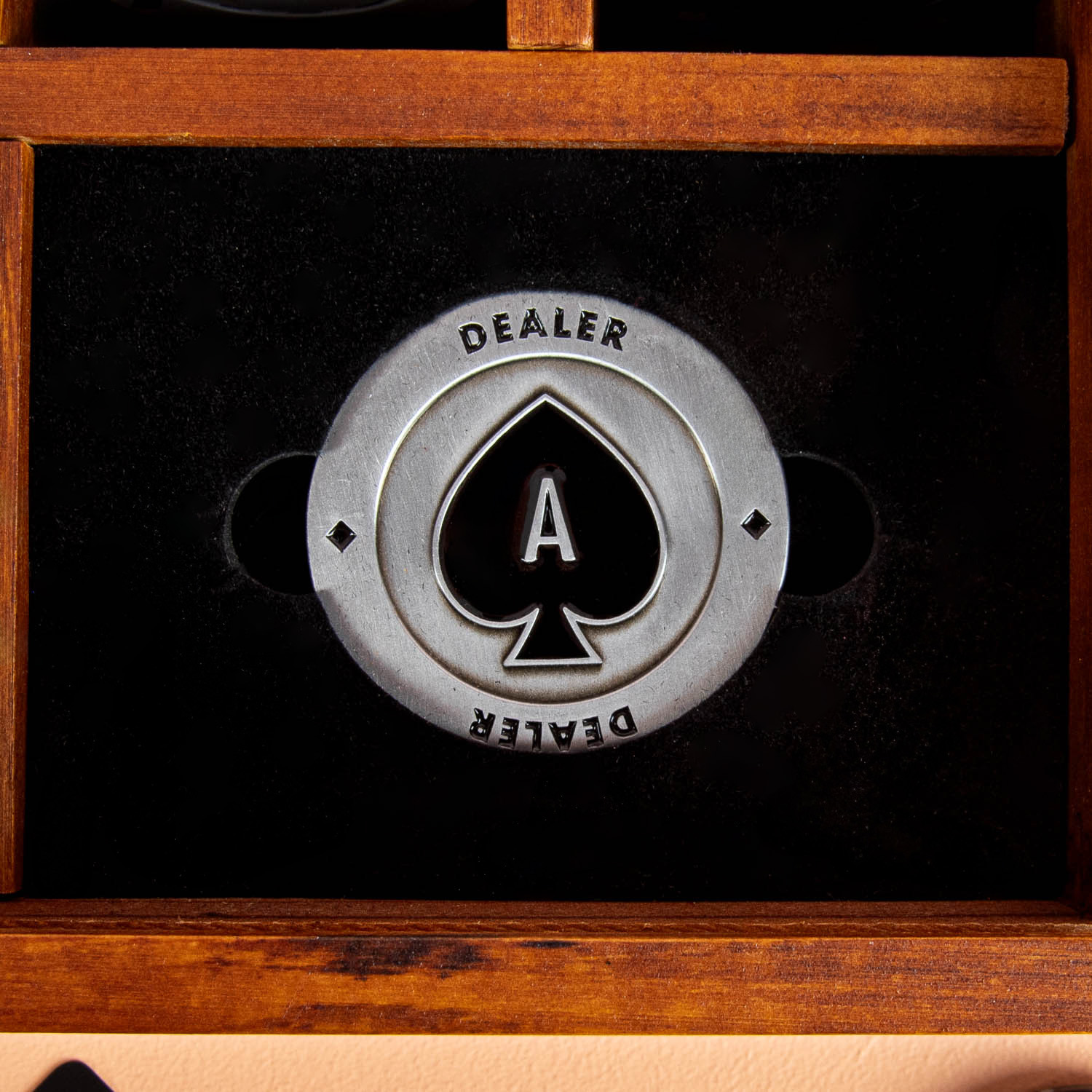 - Inhoud: 100 chips (25 stuks x 4 kleuren), zwart met gouden kaartspel en metalen dealerchip