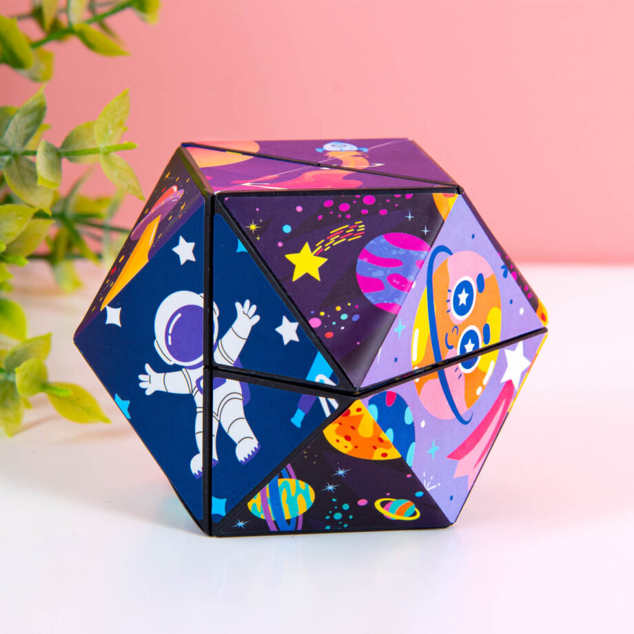 Zoek je een origineel cadeau voor een kinderverjaardag, zoek dan niet verder: de Magische ruimtekubus is goed voor urenlang speelplezier. Deze unieke puzzelkubus is op allerlei manieren in elkaar te zetten. Elke keer ontstaat er een nieuw patroon met raketten, astronauten, sterren en planeten.