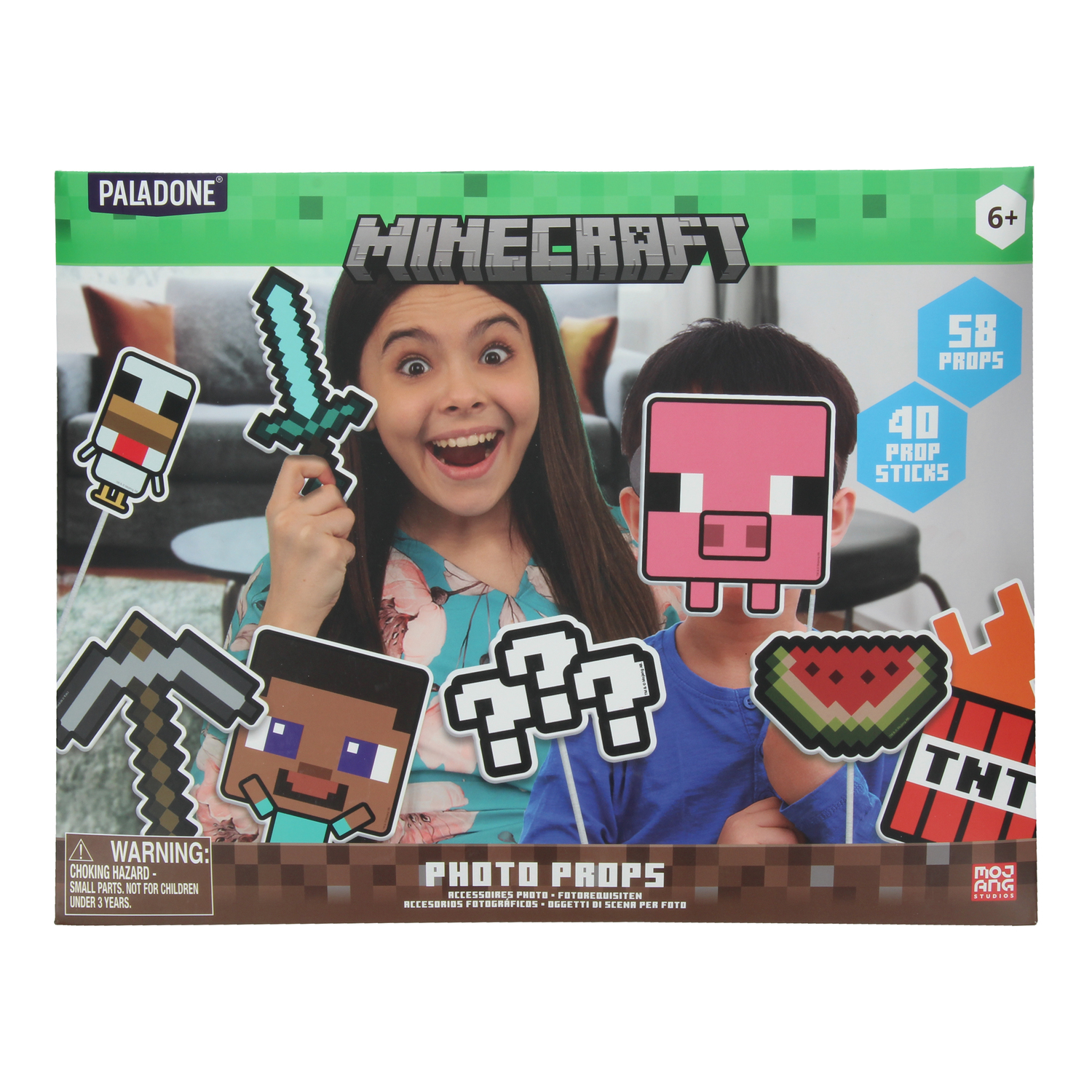 Met de Fotoprops van Minecraft maak je elke foto extra leuk. De set bevat 58 verschillende props en 40 stokjes waarmee je je favoriete blokken, tools en mobs tot leven brengt. Perfect voor feestjes en fotoshoots van jonge gamers.