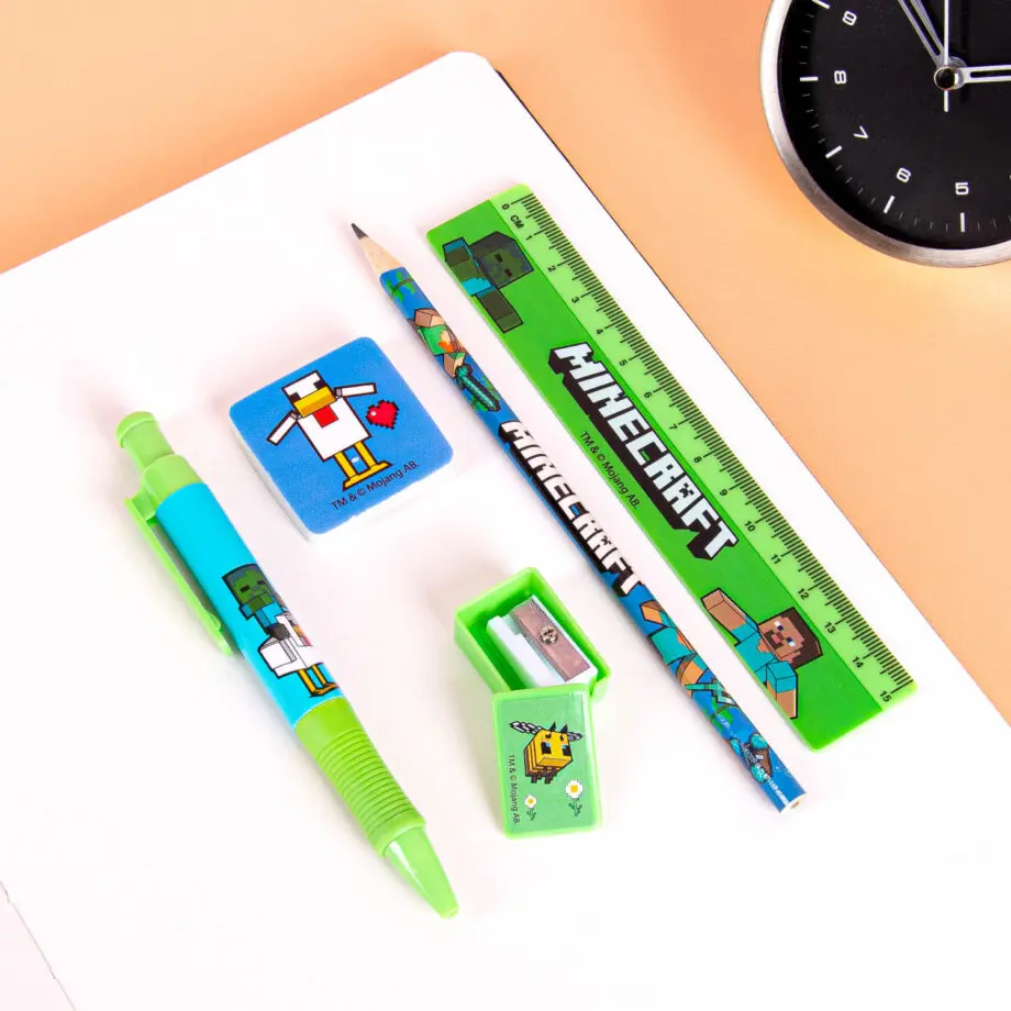 Als je liever op school ook gewoon door wilt gaan met gamen, dan kan dat – soort van – met deze leuke Minecraft schrijfset. In deze set zit een potlood, pen, gum, liniaal en puntenslijper met Minecraft thema.