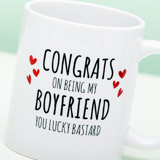 Beseft je vriend zich eigenlijk wel hoeveel geluk hij heeft met jou als zijn partner? Wel met de Mok Congrats On Being My Boyfriend. Op deze mok staat de tekst: Congrats on being my boyfriend, you lucky bastard. Elke ochtend als hij koffie uit de mok drinkt zal hij zich weer even beseffen dat hij dat is inderdaad: een mazzelkont.
