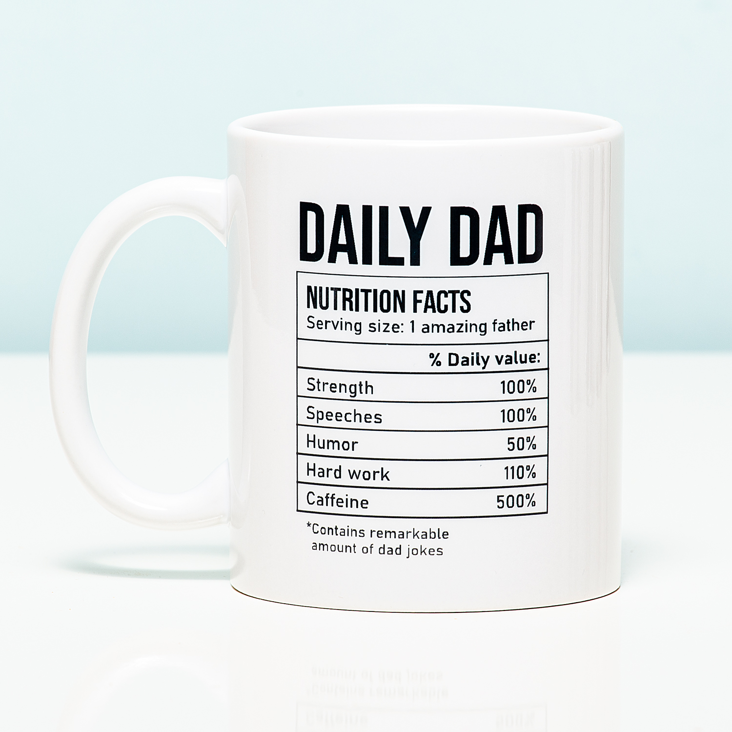 Staat je vader altijd voor je klaar? Heeft hij een hart van goud, humor en kan hij (bijna) alles? Dan is deze Daily Dad nutrition facts mok straks zijn favoriet. Op de beker staan de Daily Dad Nutrition facts for 1 amazing father. Verras je pa op Vaderdag of gewoon zomaar: hey pap, je bent amazing!