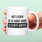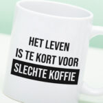 Niemand is dol op slechte koffie, maar sommige mensen maken het wel heel bont. Speciaal voor hen hebben we de Mok Het leven is te kort voor slechte koffie. Want zeg nou zelf: eigenlijk hebben ze wel een punt. Met deze beker maak je duidelijk dat jij voortaan ook alleen nog maar goede koffie drinkt. Op de beker staat de tekst: Het leven is te kort voor slechte koffie.