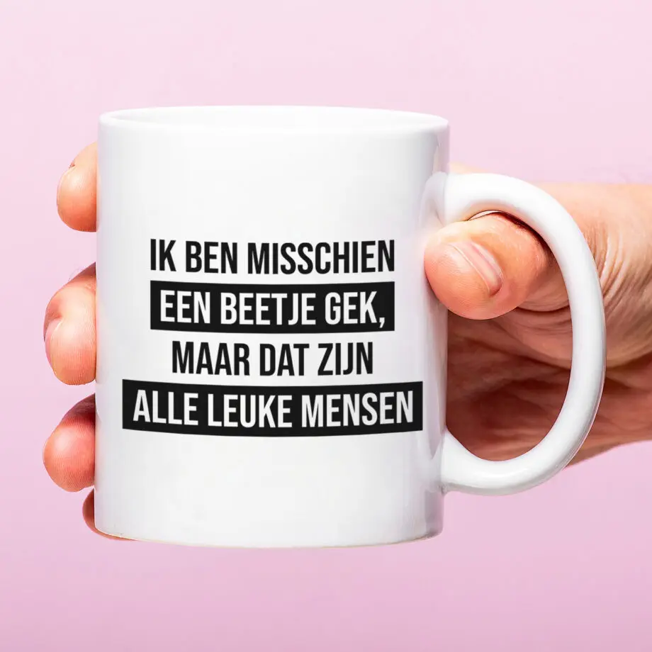 • Grappige mok met de tekst: Ik ben misschien een beetje gek, maar dat zijn alle leuke mensen