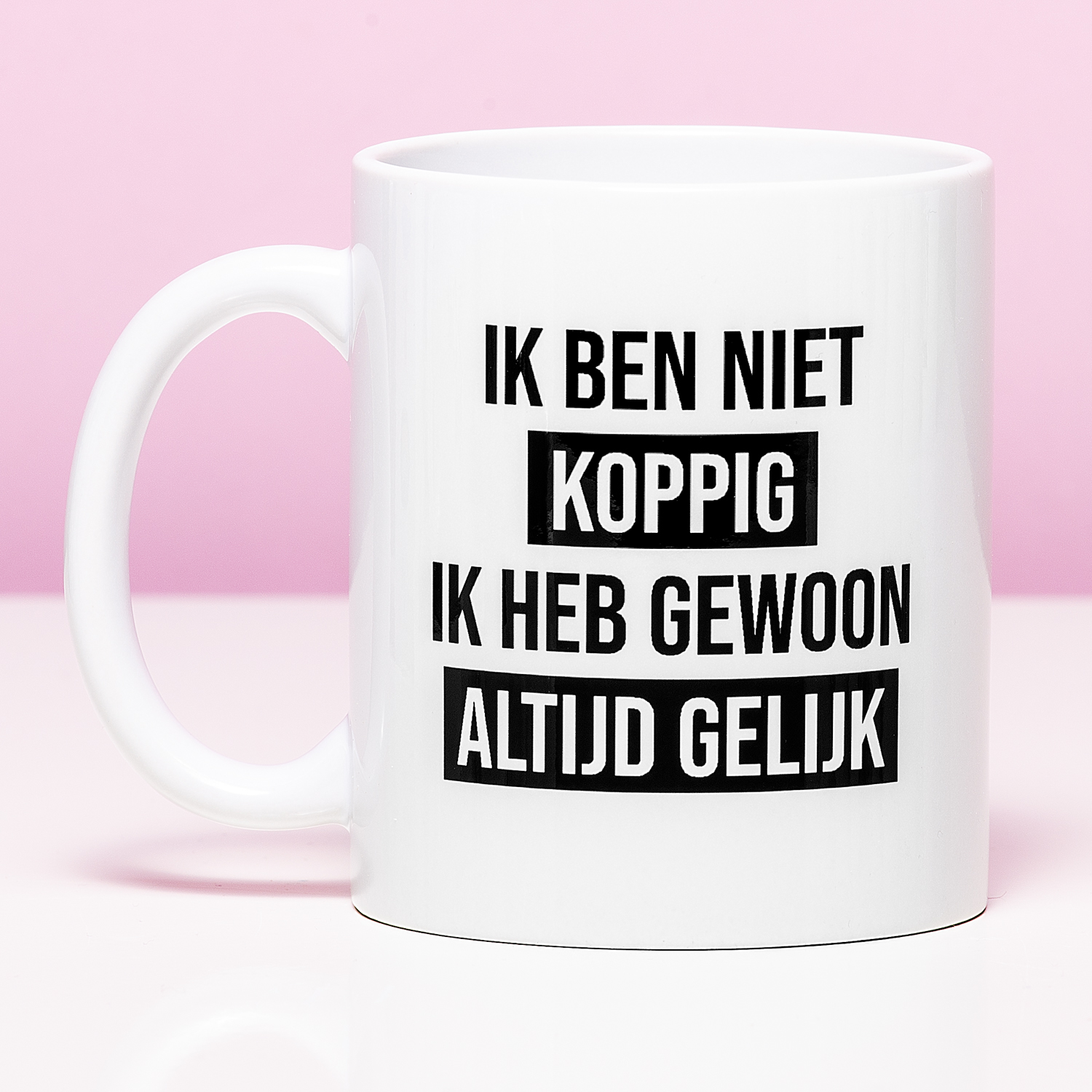 - Mok met de tekst: Ik ben niet koppig, ik heb gewoon altijd gelijk