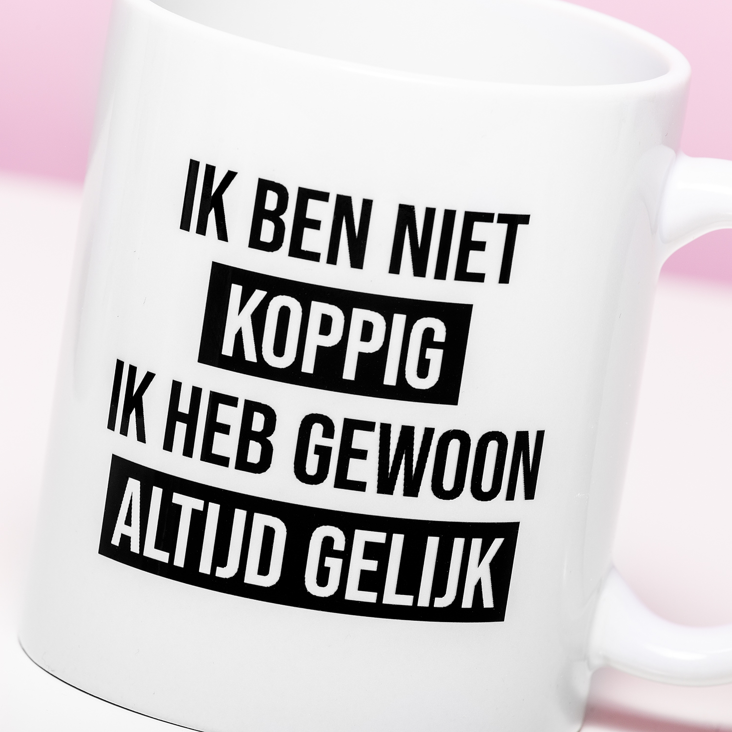 Sommige mensen hebben de nare neiging om anderen koppig te noemen. En dat terwijl je dat helemaal niet bent. Jij hebt gewoon altijd gelijk en bent daar 100% van overtuigd. Niks mis mee, toch? Drink daarom voortaan je koffie op het werk uit de Mok Ik ben niet koppig. Op de beker staat de tekst: Ik ben niet koppig, ik heb gewoon altijd gelijk. Ook leuk als kado voor iemand die echt heel eigenwijs is.