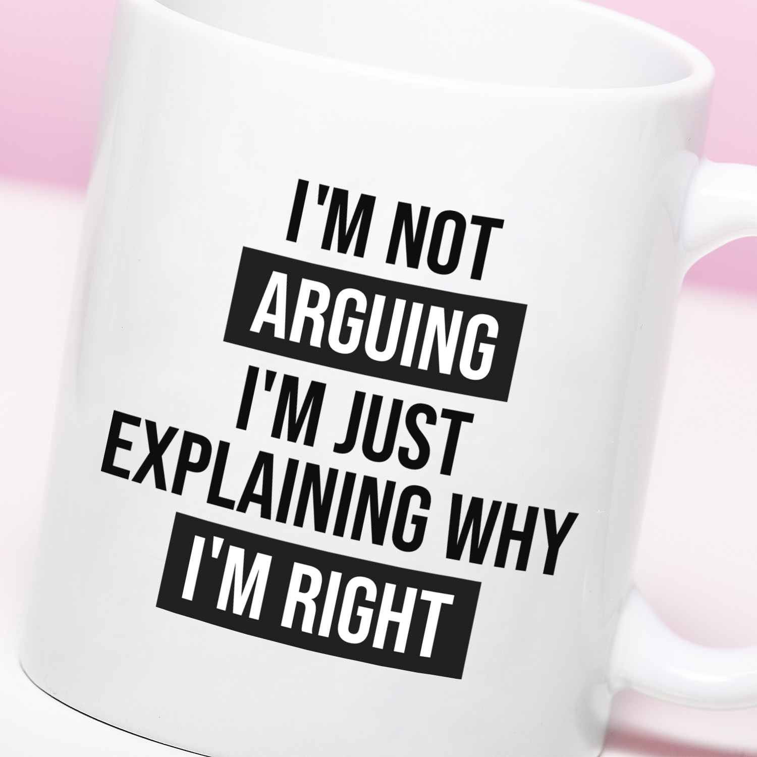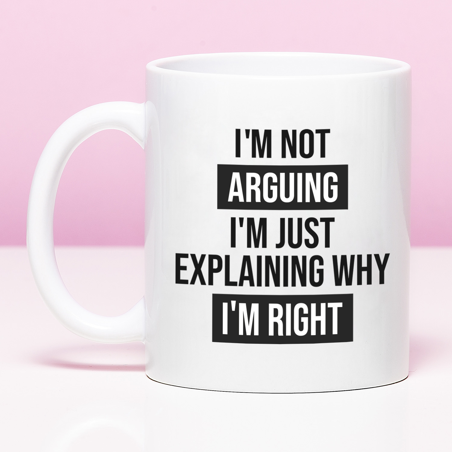 Het is super fijn, om altijd gelijk te hebben. Alleen jammer dat sommige mensen zeggen dat je ruzie maakt, als je alleen maar wilt uitleggen waarom je gelijk hebt. De Mok I’m Not Arguing legt het nog één keer uit. Op de mok staat de tekst: I’m not arguing, I’m just explaining why I’m right. Handig, toch?