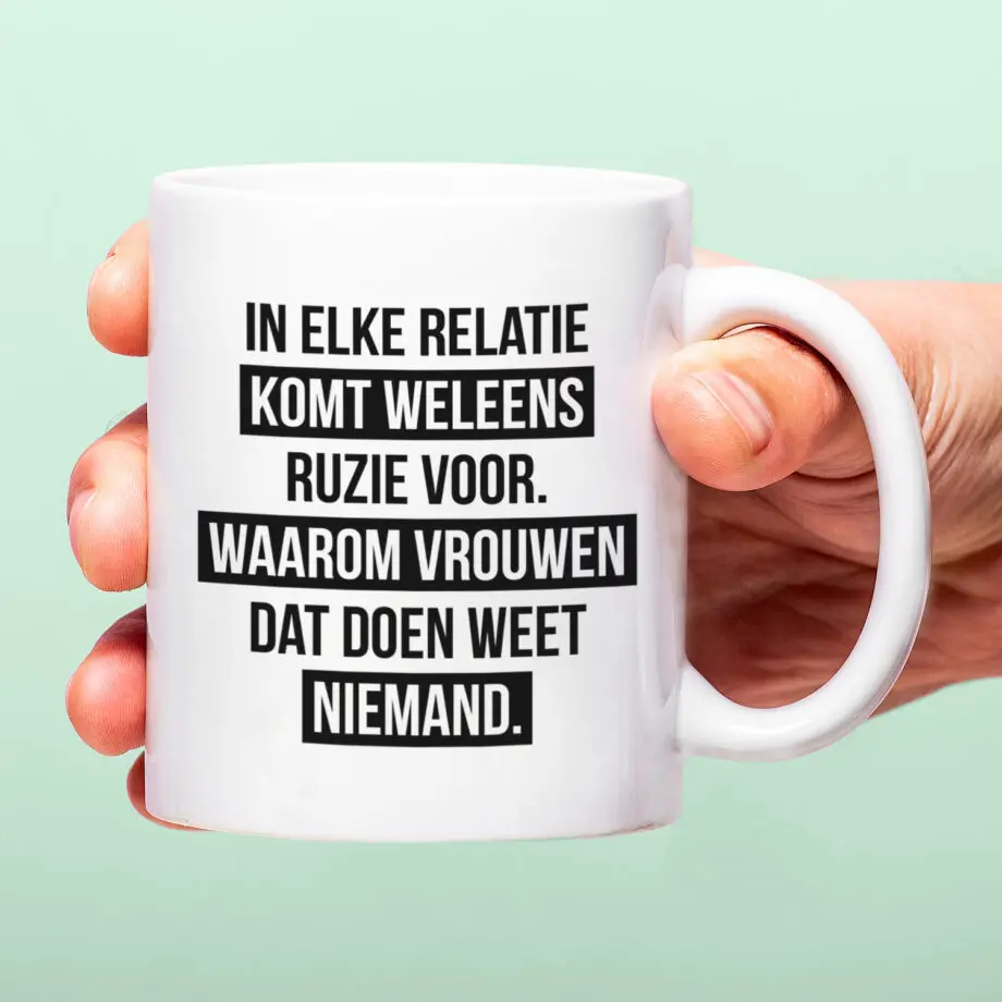 Heeft jouw partner jouw soort humor? Dan vindt ze de Mok In elke relatie komt ruzie voor vast grappig. Op de beker staat de tekst: In elke relatie komt weleens ruzie voor. Waarom vrouwen dat doen weet niemand. Een lollige mok om je vrouw te plagen als ze chagrijnig is. Maar we beloven niet dat ze het echt een geslaagde grap vindt natuurlijk.